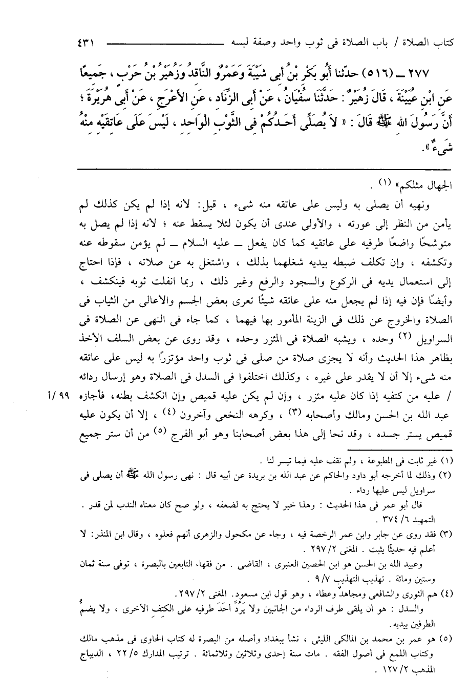 277 - (516) حدّثنا أَبُو بَكْرِ بْنُ أَبِى شَيْبَةَ وَعَمْرٌو النَّاقِدُ وَزُهَيْرُ بْنُ حَرْبٍ، جَمِيعًا عَنِ ابْنِ عُيَيْنَةَ، قَالَ زُهَيْرٌ: حَدَّثَنَا سُفْيَانُ، عَنْ أَبِى الزِّنَادِ، عَنِ الأَعْرجِ، عَنْ أَبِى هُرَيْرَةَ؛ أَنَّ رَسُولَ اللهِ صَلَّى اللهُ عَلَيْهِ وَسَلَّمَ قَالَ: " لا يُصَلِّى أَحَدُكُمْ فِى الثَّوْبِ الْوَاحِدِ، لَيْسَ عَلَى عَاتِقَيْهِ مِنْهُ شَىْءٌ ".