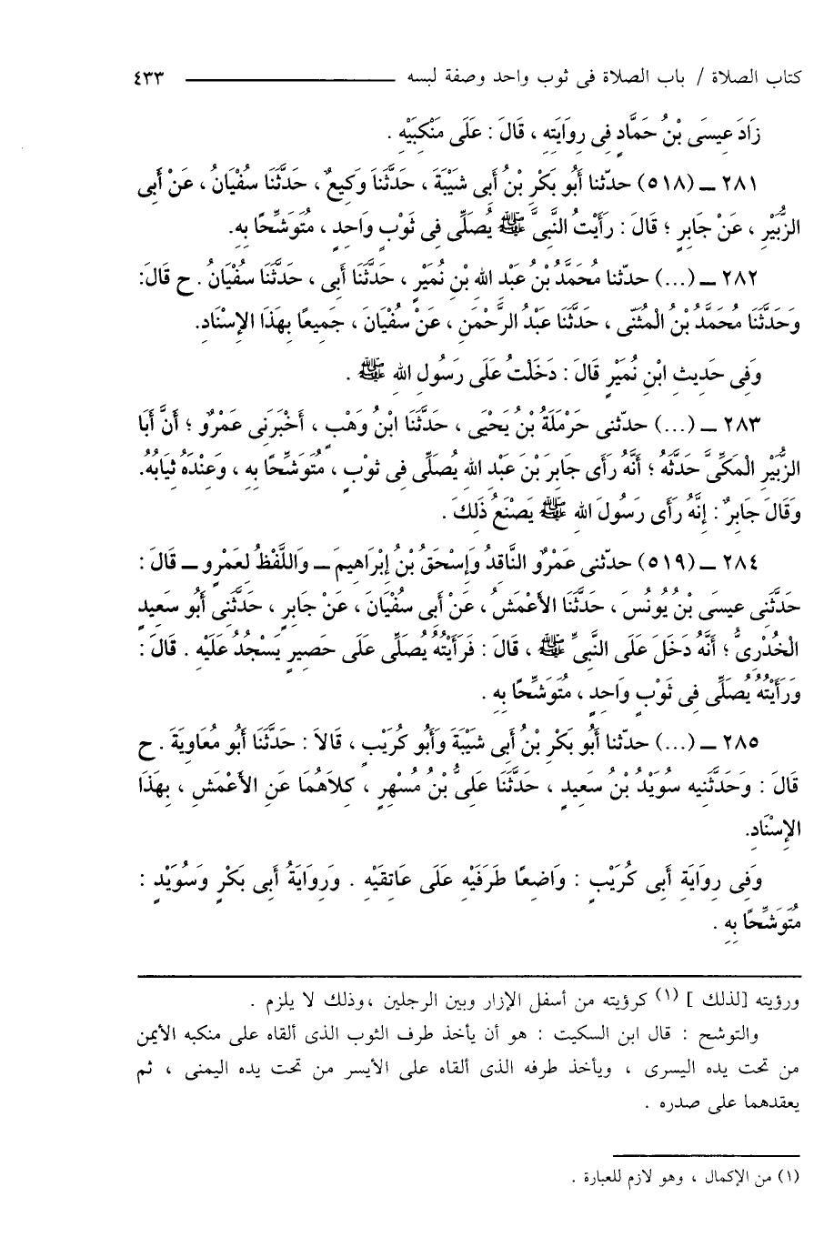 281 - (518) حدّثنا أَبُو بَكْرِ بْنُ أَبِى شَيْبَةَ، حَدَّثَنَا وَكِيعٌ، حَدَّثَنَا سُفْيَانُ، عَنْ أَبِى الزُّبَيْرِ، عَنْ جَابِرٍ؛ قَالَ: رَأَيْتُ النَبِىَّ صَلَّى اللهُ عَلَيْهِ وَسَلَّمَ يُصَلِّى فِى ثَوْبٍ وَاحِدٍ، مُتَوَشِّحًا بِهِ.