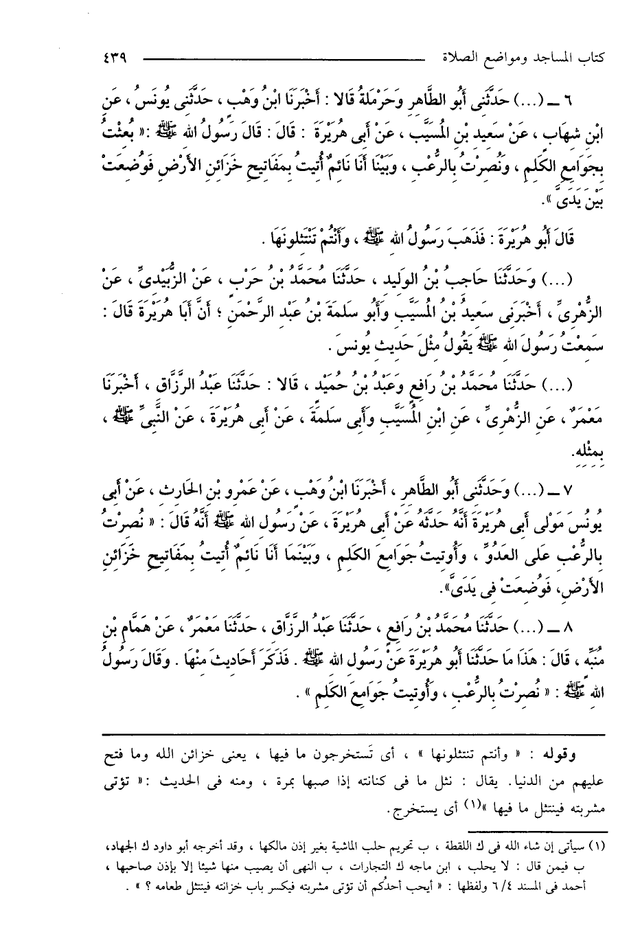 6 - (...) حَدَّثَنِى أَبُو الطَّاهِرِ وَحَرْمَلةُ قَالا: أَخْبَرَنَا ابْنُ وَهْبٍ، حَدَّثَنِى يُونسُ، عَنِ ابْنِ شِهَابٍ، عَنْ سَعِيدِ بْنِ المُسَيّب، عَنْ أَبِى هُرَيْرَةَ: قَالَ: قَالَ رَسُولُ اللهِ صَلَّى اللهُ عَلَيْهِ وَسَلَّمَ: " بُعِثْتُ بِجَوَامِعِ الكَلِمِ، وَنُصِرْتُ بِالرُّعْبِ، وَبَيْنَا أَنَا نَائِمٌ أُتِيتُ بِمَفَاتِيحِ خَزَائِنِ الأَرْضِ فَوُضِعَتْ بَيْنَ يَدَىَّ ".