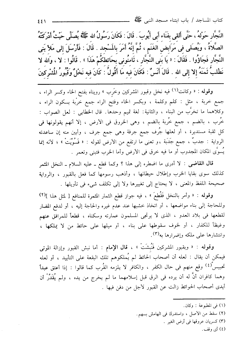 وقوله: " وبقبور المشركين فَنُبِشَتْ "، قال الإمام: أما نبش القبور وإزالة الموتى فيمكن أن يقال: لعله أن أصحاب الحائط لم يُملكوهم تلك البقعة على التأبيد، أو لعله تحبيسٌ (¬4) وقع منهم فى حال الكفر، والكافر لا يلزمه القُرب كما قالوا: إذا أعتق عبداً وهما كافران أنَّ له أن يرده فى الرق قبل إسلامهما ما لم يخرج من يده، ولم يُقَدِّرْ أن أيدى أصحاب الحوائط زالت عن القبور لأجل من دفن فيها.