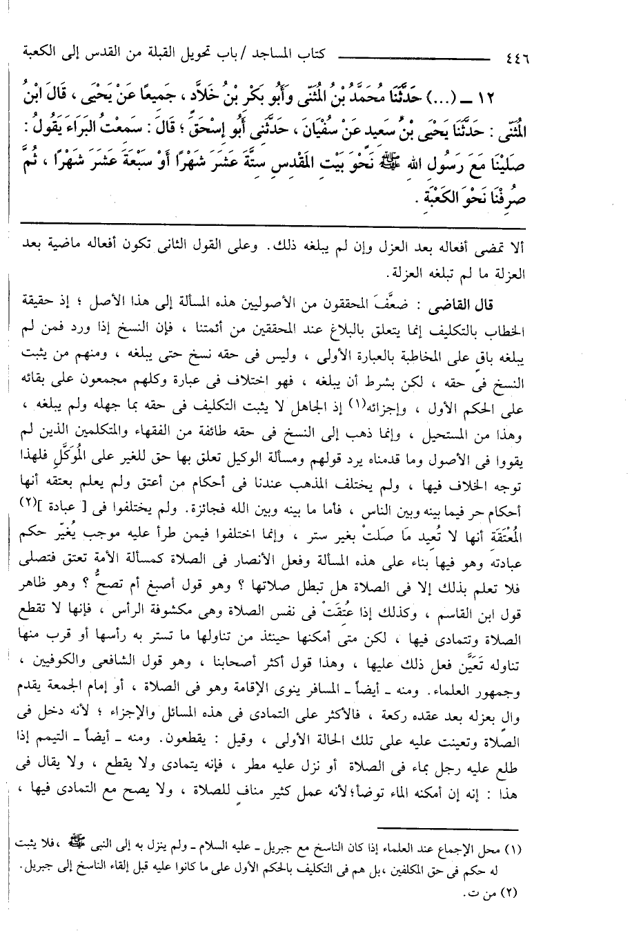 12 - (...) حَدَّثَنَا مُحَمَّدُ بْنُ المُثَنّى وَأَبُو بَكْرِ بْنُ خَلَّادٍ، جَمِيعًا عَنْ يَحْيَى، قَالَ ابْنُ المُثَنّى: حَدَّثَنَا يَحْيَى بْن سَعِيدٍ عَنْ سُفْيَانَ، حَدَّثَنِى أَبُو إِسْحَاقَ؛ قَالَ: سَمِعْتُ البَرَاءَ يَقُولُ: صَليْنَا مَعَ رَسُولِ اللهِ صَلَّى اللهُ عَلَيْهِ وَسَلَّمَ نَحْوَ بَيْتِ المَقْدِسِ سِتَّةَ عَشَرَ شَهْرًا أَوْ سَبْعَةَ عَشَرَ شَهْرًا، ثُمَّ صُرِفْنَا نَحْوَ الكَعْبَةِ.