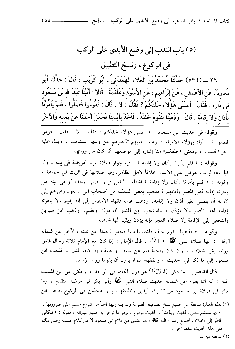 26 - (534) حَدَّثَنَا مُحَمّدُ بْنُ العَلاءِ الهَمَدَانِىُّ، أَبُو كُرَيْبٍ، قَالَ: حَدَّثَنَا أَبُو مُعَاوِيَةَ، عَنِ الأَعْمَشِ، عَنْ إِبْرَاهِيمَ، عَنِ الأَسْوَدِ وَعَلقَمَةَ. قَالا: أَتَيْنَا عَبْدَ اللهِ بْنَ مَسْعُودٍ فِى دَارِه. فَقَالَ: أَصَلَّى هَؤُلاءِ خَلفَكُمْ؟ فَقُلْنَا: لا. قَالَ: فَقُومُوا فَصَلُّوا، فَلمْ يَأمُرْنَا بِأَذَانٍ وَلا إِقَامَةٍ. قَالَ: وَذَهَبْنَا لِنَقُومَ خَلفَهُ، فَأَخَذَ بِأَيْدِينَا فَجَعَلَ أَحَدَنَا عَنْ يَمِينِهِ وَالآخَرَ