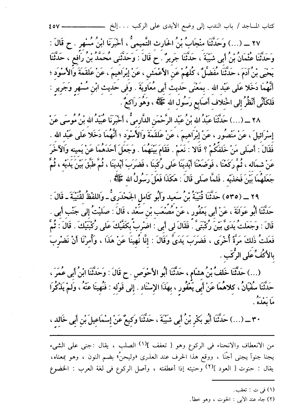 27 - (...) وحَدَّثَنَا مِنْجَابُ بْنُ الحَارِثِ التَّمِيمِىُّ، أَخْبَرَنَا ابْنُ مُسْهِرٍ. ح قَالَ: وَحَدَّثَنَا عُثْمَانُ بْنُ أَبِى شَيْبَةَ، حَدَّثَنَا جَرِيرٌ. ح قَالَ: وَحَدَّثَنِى مُحَمَّدُ بْنُ رَافِعٍ، حَدَّثَنَا يَحْيَى بْنُ آدَمَ، حَدَّثَنَا مُفَضَّلٌ، كُلهُمْ عَنِ الأَعْمَشِ، عَنْ إِبْرَاهِيمَ، عَنْ عَلْقَمَةَ وَالأَسْوَدِ؛ أَنَّهُمَا دَخَلا عَلى عَبْدِ اللهِ. بِمَعْنَى حَدِيثِ أَبِى مُعَاوِيَةَ. وفِى حَدِيثِ ابْنِ مُسْهِرٍ وَجَرِيرٍ: فَلكَأَنِّى أَنْظُرُ إِلى اخْتِلَافِ أَصَابِعِ رَسُولِ اللهِ صَلَّى اللهُ عَلَيْهِ وَسَلَّمَ، وَهُوَ رَاكِعٌ.