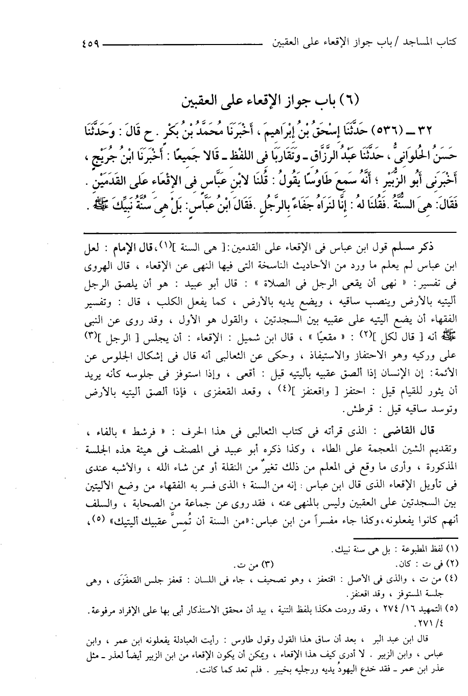 قال القاضى: الذى قرأته فى كتاب الثعالبى فى هذا الحرف: " فرشط " بالفاء، وتقديم الشين المعجمة على الطاء، وكذا ذكره أبو عبيد فى المصنف فى هيئة هذه الجلسة المذكورة، وأرى ما وقع فى المعلم من ذلك تغيرٌ من النقلة أو ممن شاء الله، والأشبه عندى فى تأويل الإقعاء الذى قال ابن عباس: إنه من السنة؛ الذى فسر به الفقهاء من وضع الأليتين بين السجدتين على العقبين وليس بالمنهى عنه، فقد روى عن جماعة من الصحابة، والسلف أنهم كانوا يفعلونه، وكذا جاء مفسراً من ابن عباس: " من السنة أن تُمِسَّ عقبيك أليتيك " (¬5)،