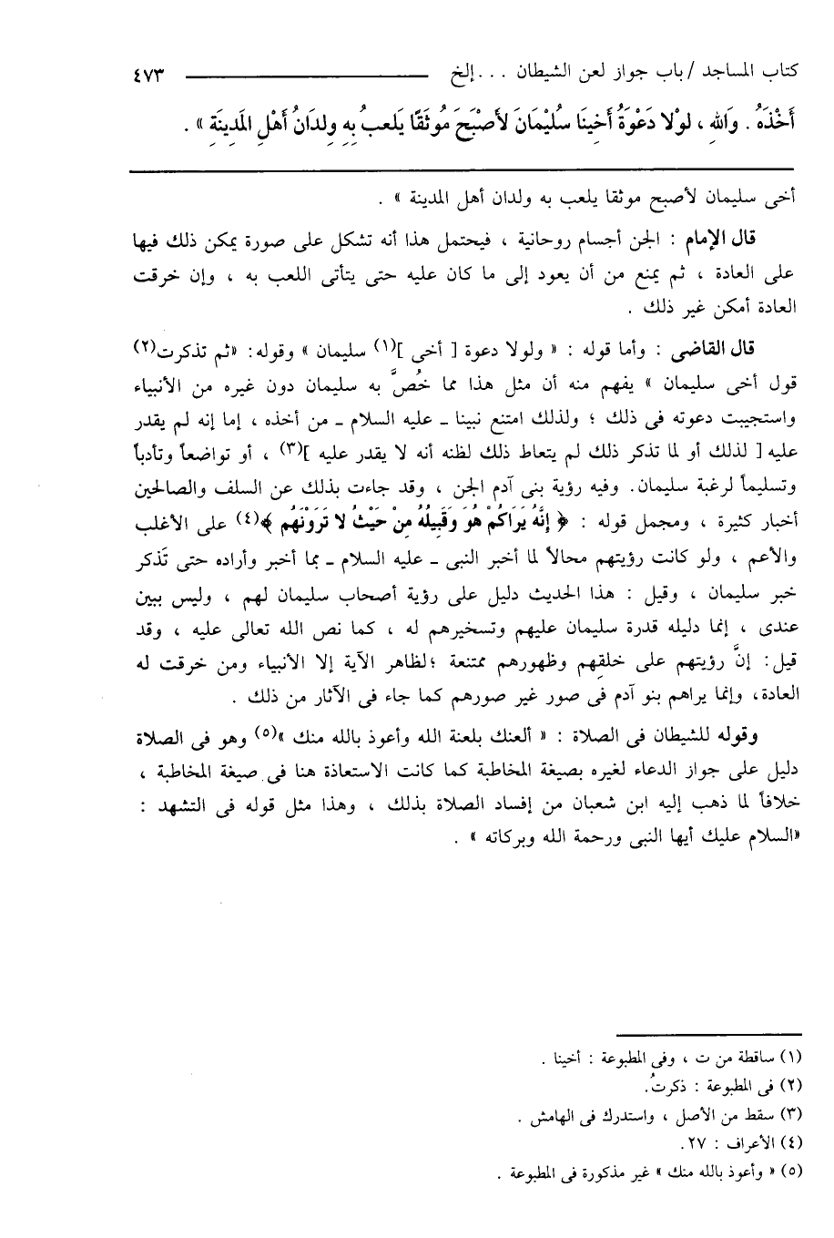 قال القاضى: وأما قوله: " ولولا دعوة [أخى] (¬1) سليمان " وقوله: " ثم تذكرت (¬2) قول أخى سليمان " يفهم منه أن مثل هذا مما خُصَّ به سليمان دون غيره من الأنبياء واستجيبت دعوته فى ذلك، ولذلك امتنع نبينا - عليه السلام - من أخذه، إما إنه لم يقدر عليه [لذلك أو لما تذكر ذلك لم يتعاط ذلك لظنه أنه لا يقدر عليه] (¬3)، أو تواضعاً وتأدباً وتسليماً لرغبة سليمان. وفيه رؤية بنى آدم الجن، وقد جاءت بذلك عن السلف والصالحين أخبار كثيرة، ومجمل قوله: {إِنَّهُ يَرَاكُمْ هُوَ وَقَبِيلُهُ مِنْ حَيْثُ لا تَرَوْنَهُم} (¬4) على الأغلب والأعم، ولو كانت رؤيتهم محالاً لما أخبر النبى - عليه السلام - بما أخبر وأراده حتى تَذكر خبر سليمان، وقيل: هذا الحديث دليل على رؤية أصحاب سليمان لهم، وليس ببين عندى، إنما دليله قدرة سليمان عليهم وتسخيرهم له، كما نص الله تعالى عليه، وقد قيل: إِنَّ رؤيتهم على خلقِهم وظهورهم ممتنعة؛ لظاهر الآية إِلا الأنبياء ومن خرقت له العادة، وإنما يراهم بنو آدم فى صور غير صورهم كما جاء فى الآثار من ذلك.