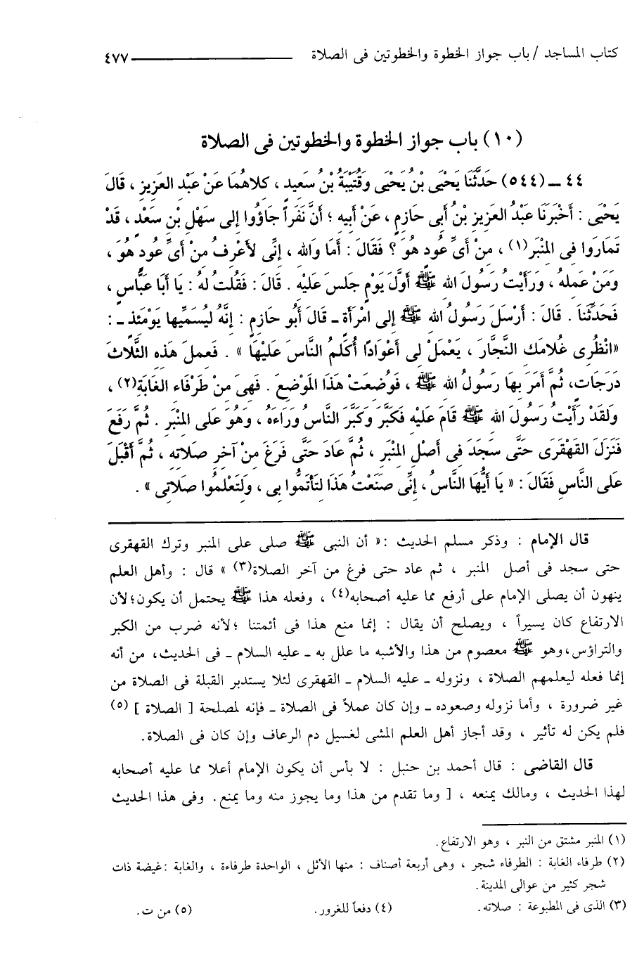 44 - (544) حَدَّثَنَا يَحْيَى بْنُ يَحْيَى وَقُتَيْبَةُ بْنُ سَعِيدٍ، كِلاهُمَا عَنْ عَبْدِ العَزِيزِ، قَالَ يَحْيَى: أَخْبَرَنَا عَبْدُ العَزِيزِ بْنُ أَبِى حَازِمٍ، عَنْ أَبِيهِ؛ أَنَّ نَفَراً جَاؤُوا إِلى سَهْلِ بْن سَعْدٍ، قَدْ تَمَارَوا فِى المِنْبَر (¬1)، مِنْ أَىِّ عُودٍ هُوَ؟ فَقَالَ: أَمَا وَاللهِ، إِنِّى لأَعْرِفُ مِنْ أَىِّ عُودٍ هُوَ، وَمَنْ عَمِلهُ، وَرَأَيْتُ رَسُولَ اللهِ صَلَّى اللهُ عَلَيْهِ وَسَلَّمَ أَوَّلَ يَوْمٍ جَلسَ عَليْهِ. قَالَ: فَقُلْتُ لهُ: يَا أَبَا عَبَّاسٍ، فَحَدِّثنَا. قَالَ: أَرْسَلَ رَسُولُ اللهِ صَلَّى اللهُ عَلَيْهِ وَسَلَّمَ إِلى امْرَأَةٍ - قَالَ أَبُو حَازِمٍ: إِنَّهُ ليُسَمِّيها يَوْمَئِذٍ -: " انْظُرِى غُلامَكِ النَّجَّارَ، يَعْمَلْ لِى أَعْوَادًا أُكُلمُ النَّاسَ عَليْهَا ". فَعمِلَ هَذِهِ الثَّلَاثَ دَرَجَاتٍ، ثُمَّ أَمَرَ بِهَا رَسُولُ اللهِ صَلَّى اللهُ عَلَيْهِ وَسَلَّمَ، فَوُضعَتْ هَذَا المَوْضِعَ. فَهِىَ مِنْ طَرْفَاءِ الغَابَةِ (¬2)، وَلقَدْ رَأَيْتُ رَسُولَ اللهِ صَلَّى اللهُ عَلَيْهِ وَسَلَّمَ قَامَ عَليْهِ فَكَبَّرَ وَكَبَّرَ النَّاسُ وَرَاءَهُ، وَهُوَ عَلى المِنْبَرِ. ثُمَّ رَفَعَ فَنَزَلَ القَهْقَرَى حَتَّى سَجَدَ فِى أَصْلِ المِنْبَرِ، ثُمَّ عَادَ حَتَّى فَرَغَ مِنْ آخِرِ صَلاتِهِ، ثُمَّ أَقْبَلَ عَلى النَّاسِ فَقَالَ: " يَا أَيُّهَا النَّاسُ، إِنِّى صَنَعْتُ هَذَا لِتَأْتَمُّوا بِى، وَلِتَعْلمُوا صَلَاتِى ".