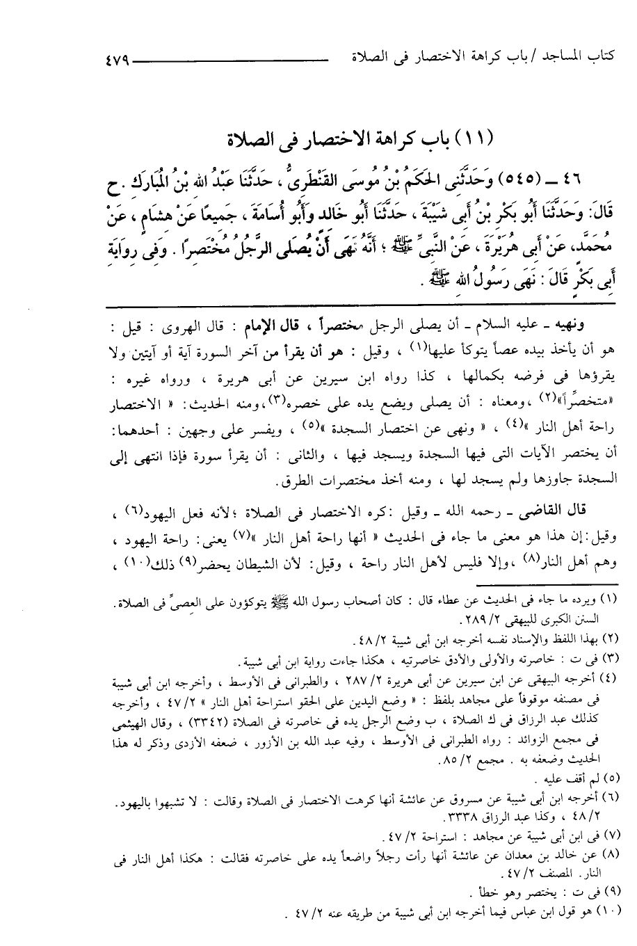46 - (545) وَحَدَّثَنِى الحَكَمُ بْنُ مُوسَى القَنْطَرِىُّ، حَدَّثَنَا عَبْدُ اللهِ بْنُ المُبَارَكِ. ح قَالَ: وَحَدَّثَنَا أَبُو بَكْرِ بْنُ أَبِى شَيْبَةَ، حَدَّثَنَا أَبُو خَالِدٍ وَأَبُو أُسَامَةَ، جَمِيعًا عَنْ هِشَامٍ، عَنْ مُحَمَّدٍ، عَنْ أَبِى هُرَيْرَةَ، عَنْ النَّبِىِّ صَلَّى اللهُ عَلَيْهِ وَسَلَّمَ؛ أَنَّهُ نَهَى أَنْ يُصَلى الرَّجُلُ مُخْتَصِرًا. وَفِى رِوَايَةِ أَبِى بَكْرٍ قَالَ: نَهَى رَسُولُ اللهِ صَلَّى اللهُ عَلَيْهِ وَسَلَّمَ.
