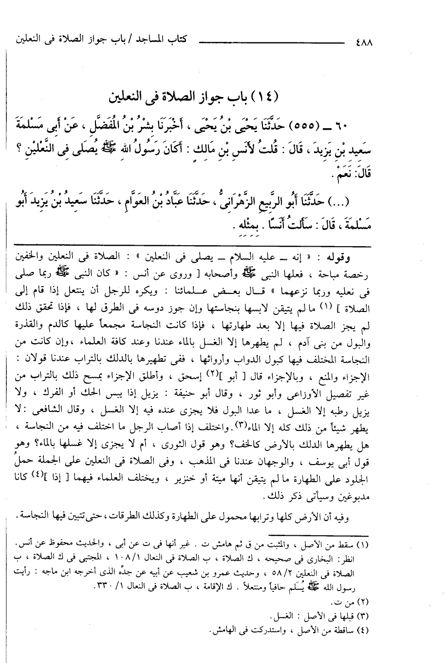 60 - (555) حَدَّثَنَا يَحْيَى بْنُ يَحْيَى، أَخْبَرَنَا بِشْرُ بْنُ المُفَضَّلِ، عَنْ أَبِى مَسْلمَةَ سَعِيدِ بْنِ يَزِيدَ، قَالَ: قُلْتُ لأَنَسِ بْنِ مَالِكٍ: أَكَانَ رَسُولُ اللهِ صَلَّى اللهُ عَلَيْهِ وَسَلَّمَ يُصَلى فِى النَّعْليْنِ؟ قَالَ: نَعَمْ.