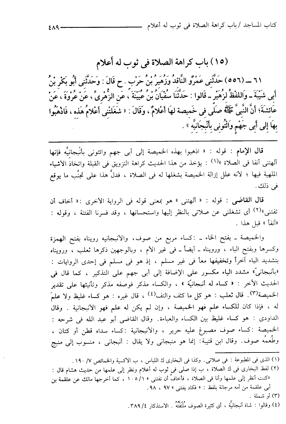 والخميصة - بفتح الخاء -: كساء مربع من صوف، والأنبجانيه رويناه بفتح الهمزة وكسرها وبفتح الباء، ورويناه - أيضاً - فى غير الأم، وبالوجهين ذكرها ثعلب، ورويناه بتشديد الباء آخراً وتخفيفها معاً فى غير مسلم، إذ هو فى مسلم فى إحدى الروايات: " بأنبجانىّ " مشدد الياء مكسور عنى الإضافة إلى أبى جهم على التذكير، كما قال فى الحديث الآخر: " كساء له أنبجانيّة "، والكساء مذكر فوصفه مذكر وتأنيثها على تقدير الخميصة (¬3). قال ثعلب: هو كل ما كثف والتف (¬4)، قال غيره: هو كساء غليظ ولا علمَ له، فإذا كان للكساء علم فهو الخميصة، وإن لم يكن له علم فهو الأنبجانية. وقال الداودى: هو كساء غليظ بين الكساء والعباءة. وقال القاضى أبو عبد الله فى شرحه: الخميصة: كساء صوف مصبوغ عليه حرير، والأنبجانية: كساء سداه قطن أو كتان، وطُعمُه صوف. وقال ابن قتيبة: إنما هو منبجانى ولا يقال: أنبجانى، منسوب إلى منبج