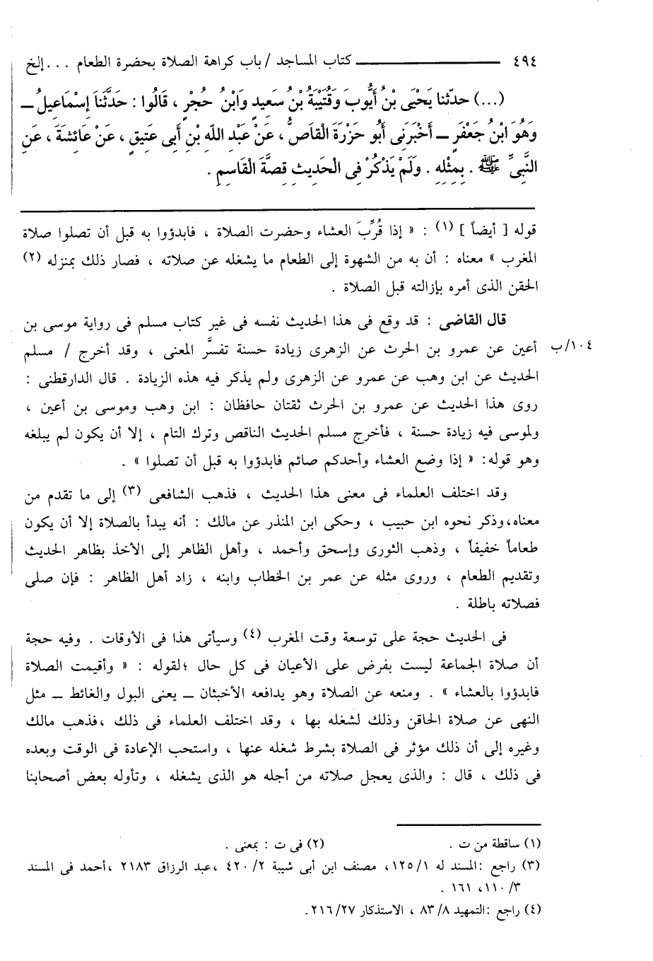 قال القاضى: قد وقع فى هذا الحديث نفسه فى غير كتاب مسلم فى رواية موسى بن أعين عن عمرو بن الحارث عن الزهرى زيادة حسنة تفسَّر المعنى، وقد أخرج مسلم الحديث عن ابن وهب عن عمرو عن الزهرى ولم يذكر فيه هذه الزيادة. قال الدارقطنى: روى هذا الحديث عن عمرو بن الحرث ثقتان حافظان: ابن وهب وموسى بن أعين، ولموسى فيه زيادة حسنة، فأخرج مسلم الحديث الناقص وترك التام، إِلا أن يكون لم يبلغه وهو قوله: " إذا وضع العشاء وأحدكم صائم فابدؤوا به قبل أن تصلوا ".
