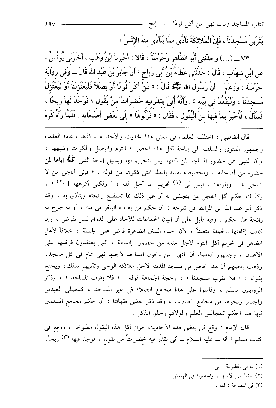73 - (...) وحدّثنى أَبُو الطَّاهِرِ وَحَرْمَلَةُ، قَالا: أَخْبَرَنَا ابْنُ وَهْبٍ، أَخْبَرَنِى يُونُسُ، عن ابْنِ شِهَابٍ، قَالَ: حَدَّثَنِى عَطَاءُ بْنُ أَبِى رَبَاحٍ؛ أَنَّ جَابِرَ بْنَ عَبْدِ الله قَالَ - وَفِى رِوَايَةِ حَرْمَلَةَ: وَزَعَمَ - أَنَّ رَسُولَ اللهِ صَلَّى اللهُ عَلَيْهِ وَسَلَّمَ قَالَ: " مَنْ أَكَلَ ثُومًا أَوْ بَصَلاً فَلْيَعْتَزِلْنَا أَوْ لِيَعْتَزِلْ مَسْجِدَنَا، وَلْيَقْعُدْ فِى بَيْتِهِ ". وَأَنَّهُ أُتِىَ بِقِدْرٍ فِيهِ خَضِرَاتٌ مِنْ بُقُولٍ؛ فَوَجَدَ لَهَا رِيحًا، فَسَأَلَ، فَأُخْبِرَ بِمَا فِيهَا مِنَ الْبُقُولِ، فَقَالَ: " قَرِّبُوهَا " إِلَى بَعْضِ أَصحَابهِ. فَلَمَّا رَآهُ كَرِهَ