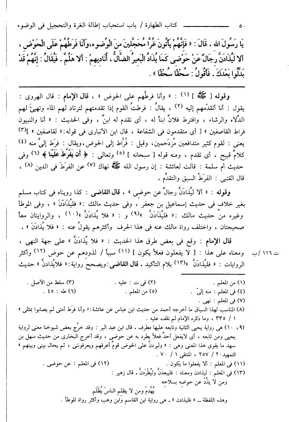 (¬9) و (¬10) هى رواية يحيى الثانية وتابعه عليها مطرف. قال ابن عبد البر: وقد خرَّج بعض شيوخنا معنى لرواية يحيى ومن تابعه، أى لا يفعل أحدٌ فعلاً يطرد به عن حوضى، وقد أخرج البخارى من حديث سهل بن سهد ما يقوى هذا المعنى وهى: " وليردنَّ على الحوض قومٌ أعرفهم ويعرفوننى، ثم يحال بينى وبينهم " التمهيد 20/ 257، المنتقى 1/ 70.