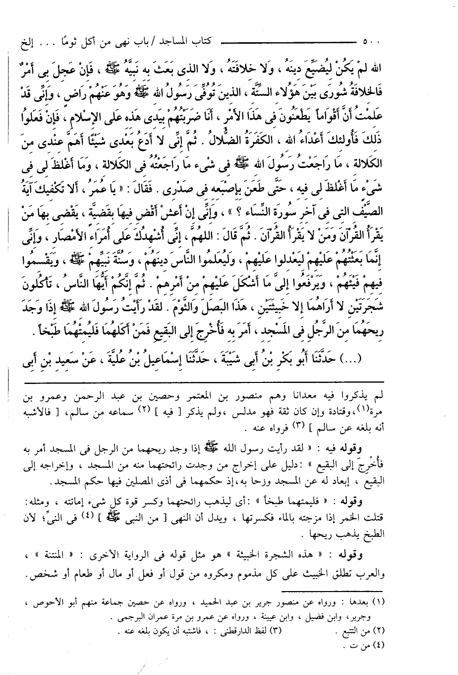 الله لمْ يَكُنْ لِيُضَيِّعَ دِينَهُ، وَلا خِلافَتَهُ، وَلا الذِى بَعَثَ بِهِ نَبِيَّهُ صَلَّى اللهُ عَلَيْهِ وَسَلَّمَ، فَإِنْ عَجِلَ بِى أَمْرٌ فَالخِلافَةُ شُورَى بَيْنَ هَؤُلاءِ السِّتَّةِ، الذِينَ تُوُفِّىَ رَسُولُ اللهِ صَلَّى اللهُ عَلَيْهِ وَسَلَّمَ وَهُوَ عَنْهُمْ رَاضٍ، وَإِنِّى قَدْ عَلِمْتُ أَنَّ أَقْوَاماً يَطْعَنُونَ فِى هَذَا الأَمْرِ، أَنَا ضَرَبْتُهُمْ بِيَدِى هَذِهِ عَلى الإِسْلامِ، فَإِنْ فَعَلوُا ذَلِكَ فَأُولئِكَ أَعْدَاءُ اللهِ، الكَفَرَةُ الضُّلالُ. ثُمَّ إِنِّى لَا أَدَعُ بَعْدِى شَيْئًا أَهَمَّ عِنْدِى مِنَ الكَلالةِ، مَا رَاجَعْتُ رَسُولَ اللهِ صَلَّى اللهُ عَلَيْهِ وَسَلَّمَ فِى شىء مَا رَاجَعْتُهُ فِى الكَلالةِ، وَمَا أَغْلظَ لِى فِى شَىْءٍ مَا أَغْلظَ لِى فِيهِ، حَتَّى طَعَنَ بِإِصْبَعِهِ فِى صَدْرِى. فَقَالَ: " يَا عُمَرُ، أَلا تَكْفِيكَ آيَةُ الصَّيْفِ التِى فِى آخِرِ سُورَةِ النِّسَاءِ؟ "، وَإِنِّى إِنْ أَعِشْ أَقْضِ فِيهَا بِقَضِيَّةٍ، يَقْضِى بِهَا مَنْ يَقْرَأُ الْقُرْآنَ وَمَنْ لا يَقْرَأُ الْقُرْآنَ. ثُمَّ قَالَ: اللهُمَّ، إِنِّى أُشْهِدُكَ عَلى أُمَرَاءِ الأَمْصَارِ، وَإِنِّى إِنَّمَا بَعَثْتُهُمْ عَليْهِمْ لِيَعْدِلوا عَليْهِمْ، وَليُعَلمُوا النَّاسَ دِينَهُمْ، وَسُنَّةَ نَبِيِّهِمْ صَلَّى اللهُ عَلَيْهِ وَسَلَّمَ، وَيَقْسِمُوا فِيهِمْ فَيْئَهُمْ، وَيَرْفَعُوا إِلىَّ مَا أَشْكَلَ عَليْهِمْ مِنْ أَمْرِهِمْ. ثُمَّ إِنَّكُمْ أَيُّهَا النَّاسُ، تَأْكُلونَ شَجَرَتَيْنِ لا أَرَاهُمَا إِلا خَبِيثَتَيْنِ، هَذَا البَصَلَ وَالثُّوْمَ. لقَدْ رَأَيْتُ رسُولَ اللهِ صَلَّى اللهُ عَلَيْهِ وَسَلَّمَ إِذَا وَجَدَ رِيحَهُمَا مِنَ الرَّجُلِ فِى المَسْجِدِ، أَمَرَ بِهِ فَأُخْرِجَ إِلى البَقِيعِ فَمَنْ أَكَلهُمَا فَليُمِتْهُمَا طَبْخاً.