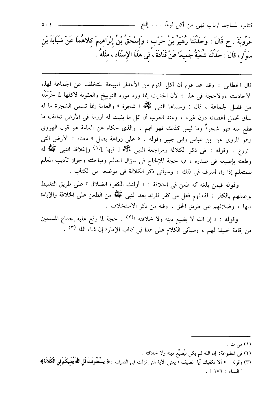 قال الخطابى: وقد عد قوم أن أكل الثوم من الأعذار المبيحة للتخلف عن الجماعة لهذه الأحاديث، ولا حجة فى هذا؛ لأن الحديث إنما ورد مورد التوبيخ والعقوبة لأكلها لما حَرَمَتْه من فضل الجماعة، قال: وسماها النبى صَلَّى اللهُ عَلَيْهِ وَسَلَّمَ " شجرة " والعامة إنما تسمى الشجرة ما له ساق تحمل أغصانه دون غيره، وعند العرب أن كل ما بقيت له أرومة فى الأرض تخلف ما قطع منه فهو شجرةٌ وما ليس كذلك فهو نجم، والذى حكاه عن العامة هو قول الهروى وهو المروى عن ابن عباس وابن جبير وقوله: " على زراعة بصل " معناه: الأرض التى تزرع. وقوله: فى ذكر الكلالة ومراجعة النبى صَلَّى اللهُ عَلَيْهِ وَسَلَّمَ [فيها] (¬1) وإغلاظ النبى صَلَّى اللهُ عَلَيْهِ وَسَلَّمَ له وطعنه بإصبعه فى صدره، فيه حجة للإلحاح فى سؤال العالم ومباحثته وجواز تأديب المعلم للمتعلم إذا رآه أسرف فى ذلك، وسيأتى ذكر الكلالة فى موضعه من الكتاب.