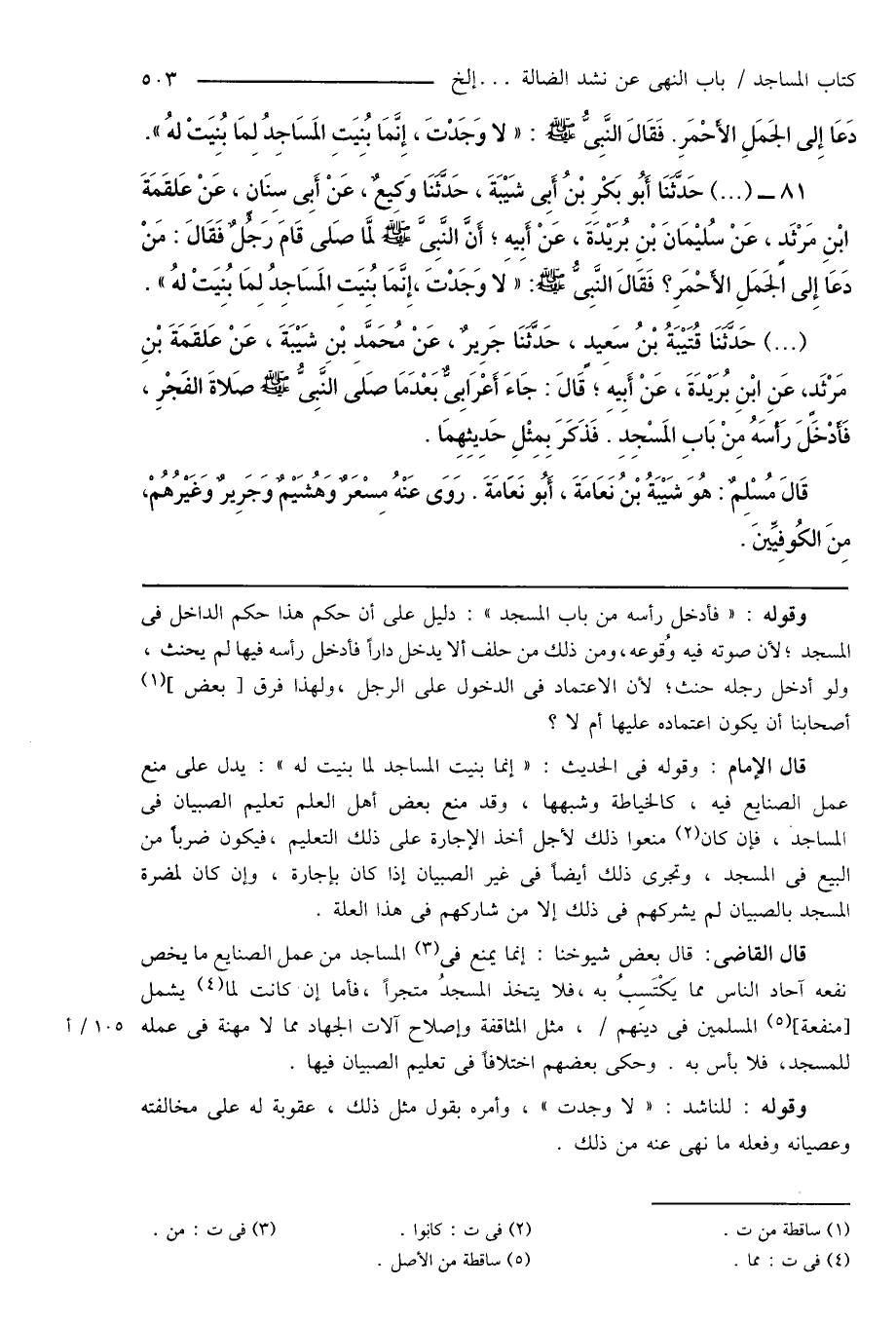 81 - (...) حَدَّثَنَا أَبُو بَكْرِ بْنُ أَبِى شَيْبَةَ، حَدَّثَنَا وَكِيعٌ، عَنْ أَبِى سِنَانٍ، عَنْ عَلْقَمَةَ ابْنِ مَرْثَدٍ، عَنْ سُليْمَانَ بْنِ بُرَيْدَةَ، عَنْ أَبِيهِ؛ أَنَّ النَّبِىَّ صَلَّى اللهُ عَلَيْهِ وَسَلَّمَ لمَّا صَلى قَامَ رَجُلٌ فَقَالَ: مَنْ دَعَا إِلى الجَمَلِ الأَحْمَرِ؟ فَقَالَ النَّبِىُّ صَلَّى اللهُ عَلَيْهِ وَسَلَّمَ " لَا وَجَدْتَ، إِنَّمَا بُنِيَتِ المَسَاجِدُ لِمَا بُنِيَتْ لهُ ".
