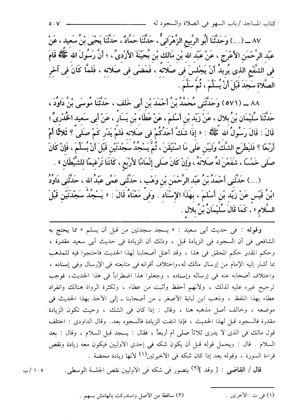 87 - (...) وَحَدَّثَنَا أَبُو الرَّبِيعِ الزَّهْرَانِىُّ، حَدَّثَنَا حَمَّادٌ، حَدَّثَنَا يَحْيَى بْنُ سَعِيدٍ، عَنْ عَبْدِ الرَّحْمَنِ الأَعْرَجِ، عَنْ عَبْدِ اللهِ بْنِ مَالِكٍ بنِ بُحَيْنَةَ الأَزْدِىِّ؛ أَنَّ رَسُولَ اللهِ صَلَّى اللهُ عَلَيْهِ وَسَلَّمَ قَامَ فِى الشَّفْعِ الذِى يُرِيدُ أَنْ يَجْلِسَ فِى صَلاتِهِ، فَمَضَى فِىَ صَلاتِهِ، فَلمَّا كَانَ فِى آخِرِ الصَّلاةِ سَجَدَ قَبْلَ أَنْ يُسَلِّمَ، ثُمَّ سَلَّمَ.