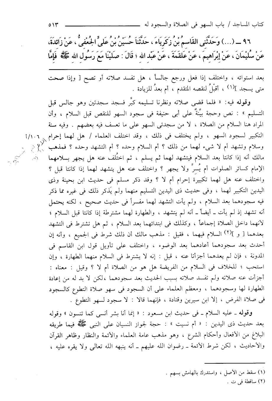 96 - (...) وَحَدَّثَنِى القَاسِمُ بْنُ زَكَرِياءَ، حَدَّثَنَا حُسَيْنُ بْنُ عَلىٍّ الجُعْفِىُّ، عَنْ زَائِدَةَ، عَنْ سُليْمَانَ، عَنْ إِبْرَاهِيمَ، عَنْ عَلْقَمَةَ، عَنْ عَبْدِ اللهِ؛ قَالَ: صَليْنَا مَعَ رَسُولِ اللهِ صَلَّى اللهُ عَلَيْهِ وَسَلَّمَ فَإِمَّا