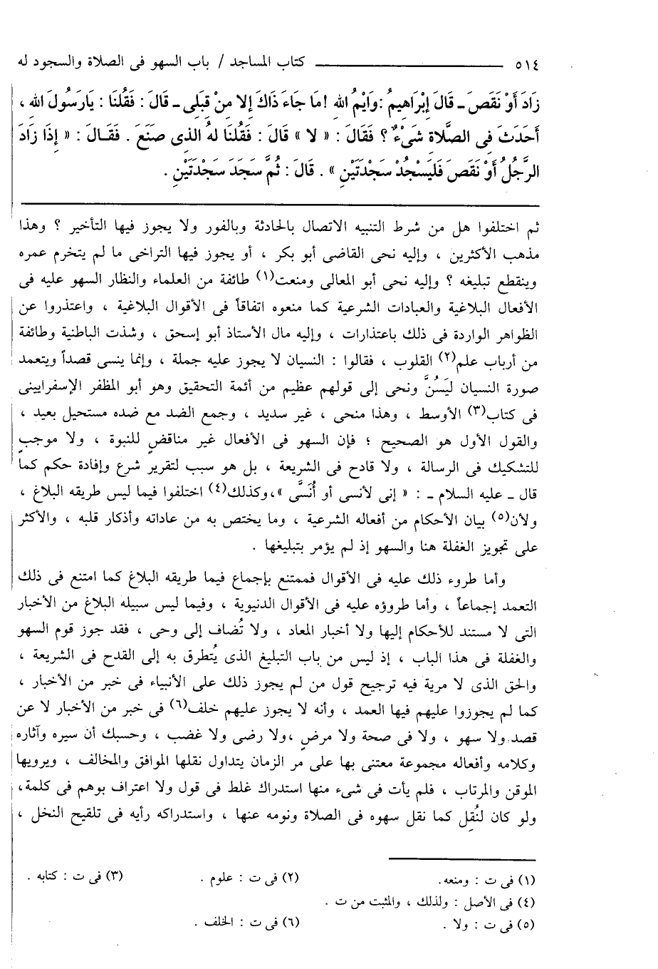 ثم اختلفوا هل من شرط التنبيه الاتصال بالحادثة وبالفور ولا يجوز فيها التأخير؟ وهذا مذهب الأكثرين، وإليه نحى القاضى أبو بكر، أو يجوز فيها التراخى ما لم يتخرم عمره وينقطع تبليغه؟ وإليه نحى أبو المعالى ومنعت (¬1) طائفة من العلماء والنظار السهو عليه فى الأفعال البلاغية والعبادات الشرعية كما منعوه اتفاقاً فى الأقوال البلاغية، واعتذروا عن الظواهر الواردة فى ذلك باعتذارات، وإليه مال الأستاذ أبو إسحاق، وشذت الباطنية وطائفة من أرباب علم (¬2) القلوب، فقالوا: النسيان لا يجوز عليه جملة، وإنما ينسى قصداً ويتعمد صورة النسيان ليَسُنَّ ونحى إلى قولهم عظيم من أئمة التحقيق وهو أبو المظفر الإسفرايينى فى كتاب (¬3) الأوسط، وهذا منحى، غير سديد، وجمع الضد مع ضده مستحيل بعيد، والقول الأول هو الصحيح؛ فإن السهو فى الأفعال غير مناقضٍ للنبوة، ولا موجبٍ للتشكيك فى الرسالة، ولا قادح فى الشريعة، بل هو سبب لتقرير شرع وإفادة حكم كما قال - عليه السلام -: " إنى لأنسى أو أُنَسَّى "، وكذلك (¬4) اختلفوا فيما ليس طريقه البلاغ، ولأن (¬5) بيان الأحكام من أفعاله الشرعية، وما يختص به من عاداته وأذكار قلبه، والأكثر على تجويز الغفلة هنا والسهو إذ لم يؤمر بتبليغها.
