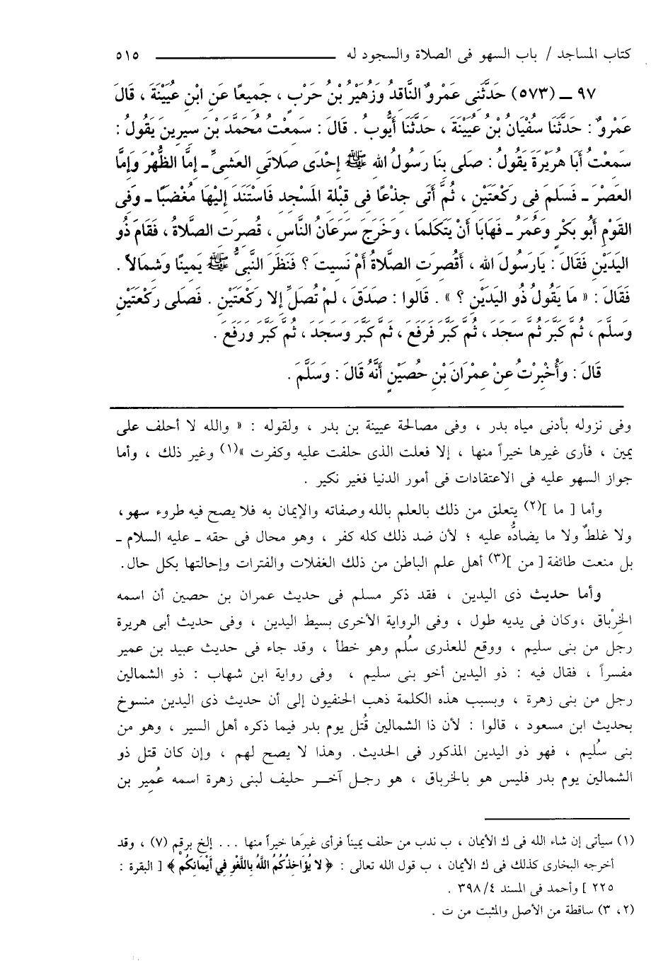 97 - (573) حَدَّثَنِى عَمْروٌ النَّاقِدُ وَزُهَيْرُ بْنُ حَرْبٍ، جَمِيعًا عَنِ ابْنِ عُيَيْنَةَ، قَالَ عَمْروٌ: حَدَّثَنَا سُفْيَانُ بْنُ عُيَيْنَةَ، حَدَّثَنَا أَيُّوبُ. قَالَ: سَمِعْتُ مُحَمَّدَ بْنَ سِيرِينَ يَقُولُ: سَمِعْتُ أَبَا هُرَيْرَةَ يَقُولُ: صَلى بِنَا رَسُولُ اللهِ صَلَّى اللهُ عَلَيْهِ وَسَلَّمَ إِحْدَى صَلاتَىِ العَشِىِّ - إِمَّا الظُّهْرَ وَإِمَّا العَصْرَ - فَسَلمَ فِى رَكْعَتَيْنِ، ثُمَّ أَتَى جِذْعًا فِى قِبْلةِ المَسْجِدِ فَاسْتَنَدَ إِليْهَا مُغْضَبًا - وَفِى القَوْمِ أَبُو بَكْرٍ وَعُمَرُ - فَهَابَا أَنْ يَتَكَلمَا، وَخَرَجَ سَرَعَانُ النَّاسِ، قُصِرَتِ الصَّلاةُ، فَقَامَ ذُو اليَدَيْنِ فَقَالَ: يَا رَسُولَ اللهِ، أَقُصِرَتِ الصَّلاةُ أَمْ نَسِيتَ؟ فَنَظَرَ النَّبِىُّ صَلَّى اللهُ عَلَيْهِ وَسَلَّمَ يَمِينًا وَشِمَالاً. فَقَالَ: " مَا يَقُولُ ذُو اليَدَيْنِ؟ ". قَالوا: صَدَقَ، لمْ تُصَلِّ إِلا رَكْعَتَيْنِ. فَصَلى رَكْعَتَيْنِ وَسلَّمَ، ثُمَّ كَبَّرَ ثُمَّ سَجَدَ، ثُمَّ كَبَّرَ فَرَفَعَ، ثَمَّ كَبَّرَ وَسَجَدَ، ثُمَّ كَبَّرَ وَرَفَعَ.