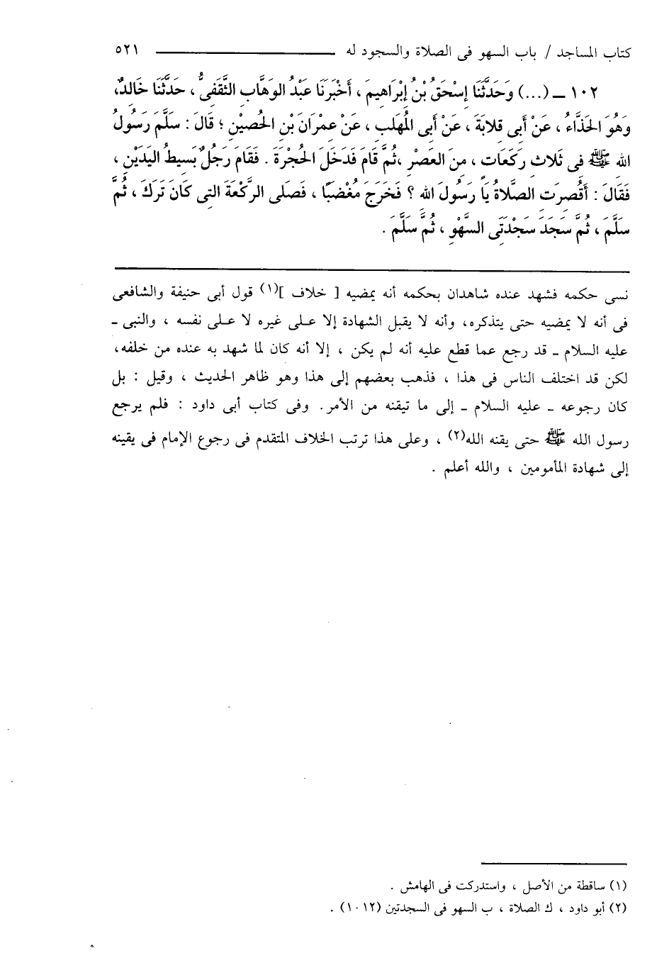 102 - (...) وَحَدَّثَنَا إِسْحَاقُ بْنُ إِبْرَاهِيمَ، أَخْبَرَنَا عَبْدُ الوَهَّابِ الثَّقَفِىُّ، حَدَّثَنَا خَالِدٌ، وَهُوَ الحَذَّاءُ، عَنْ أَبِى قِلابَةَ، عَنْ أَبِى المُهَلبِ، عَنْ عِمْرَانَ بْنِ الحُصيْنِ؛ قَالَ: سَلَّمَ رَسُولُ اللهِ صَلَّى اللهُ عَلَيْهِ وَسَلَّمَ فِى ثَلاثِ رَكَعَاتٍ، مِنَ العَصْرِ، ثُمَّ قَامَ فَدَخَلَ الحُجْرَةَ. فَقَامَ رَجُلٌ بَسِيطُ اليَدَيْنِ، فَقَالَ: أَقُصِرَتِ الصَّلاةُ يَا رَسُولَ اللهِ؟ فَخَرَجَ مُغْضَبًا، فَصَلى الرَّكْعَةَ التِى كَانَ تَرَكَ، ثُمَّ سَلَّمَ، ثُمَّ سَجَدَ سَجْدَتَى السَّهْوِ، ثُمَّ سَلَّمَ.