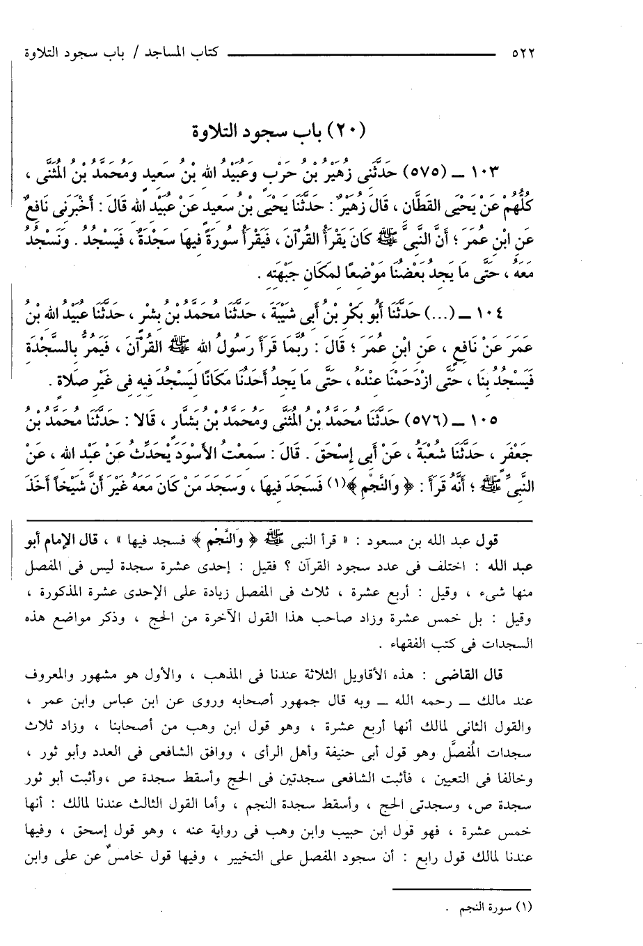 105 - (576) حَدَّثَنَا مُحَمَّدُ بْنُ المُثَنَّى وَمُحَمَّدُ بْنُ بَشَّارٍ، قَالا: حَدَّثَنَا مُحَمَّدُ بْنُ جَعْفَرٍ، حَدَّثَنَا شُعْبَةُ، عَنْ أَبِى إِسْحَاقَ. قَالَ: سَمِعْتُ الأَسْوَدَ يْحَدِّثُ عَنْ عَبْدِ اللهِ، عَنْ النَّبِىِّ صَلَّى اللهُ عَلَيْهِ وَسَلَّمَ؛ أَنَّهُ قَرَأَ: {وَالنَّجْمِ} (¬1) فَسَجَدَ فِيهَا، وَسَجَدَ مَنْ كَانَ مَعَهُ غَيْرَ أَنَّ شَيْخاً أَخَذَ