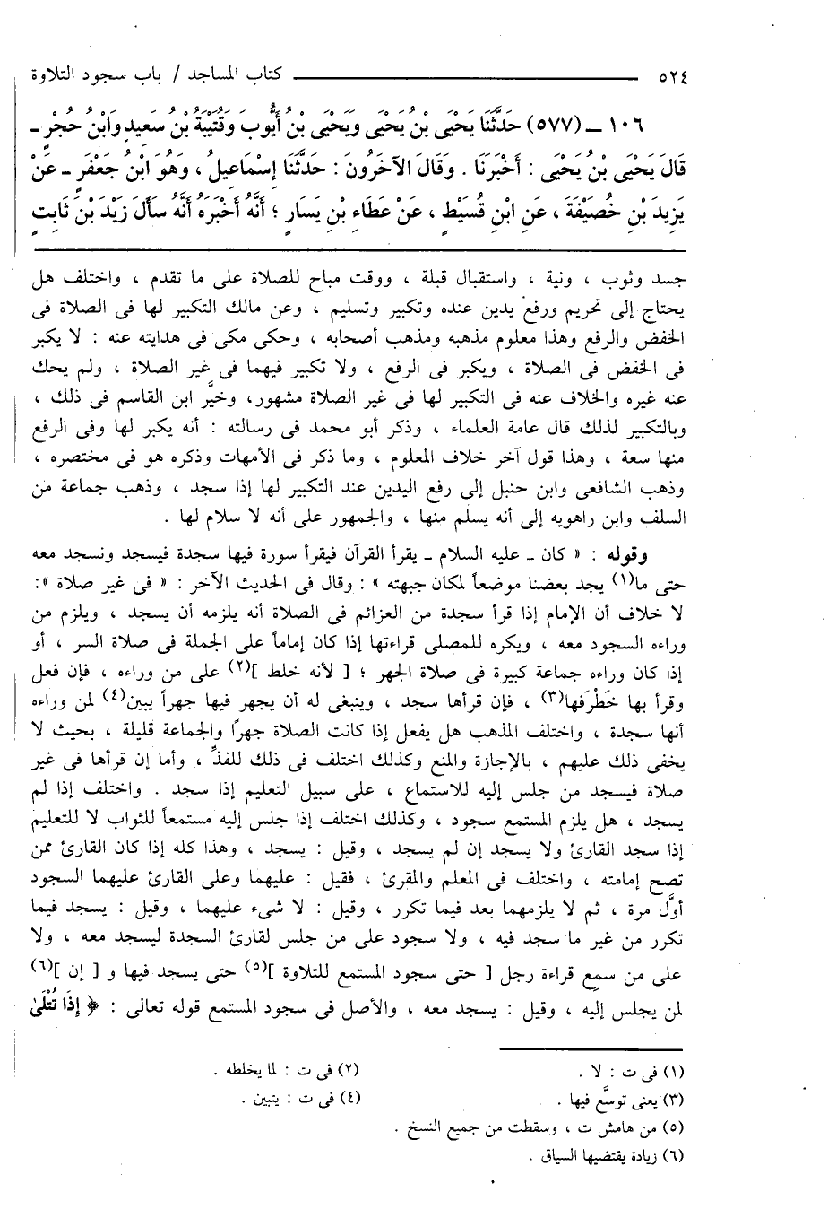 106 - (577) حَدَّثَنَا يَحْيَى بْنُ يَحْيَى وَيَحْيَى بْنُ أَيُّوبَ وَقُتَيْبَةُ بْنُ سَعِيدٍ وَابْنُ حُجْرٍ - قَالَ يَحْيَى بْنُ يَحْيَى: أَخْبَرَنَا. وَقَالَ الآخَرُونَ: حَدَّثَنَا إِسْمَاعِيلُ، وَهُوَ ابْنُ جَعْفَرٍ - عَنْ يَزِيدَ بْنِ خُصَيْفَةَ، عَنِ ابْنِ قُسَيْطٍ، عَنْ عَطَاءِ بْنِ يَسَارٍ؛ أَنَّهُ أَخْبَرَهُ أَنَّهُ سَأَلَ زَيْدَ بْنَ ثَابِتٍ