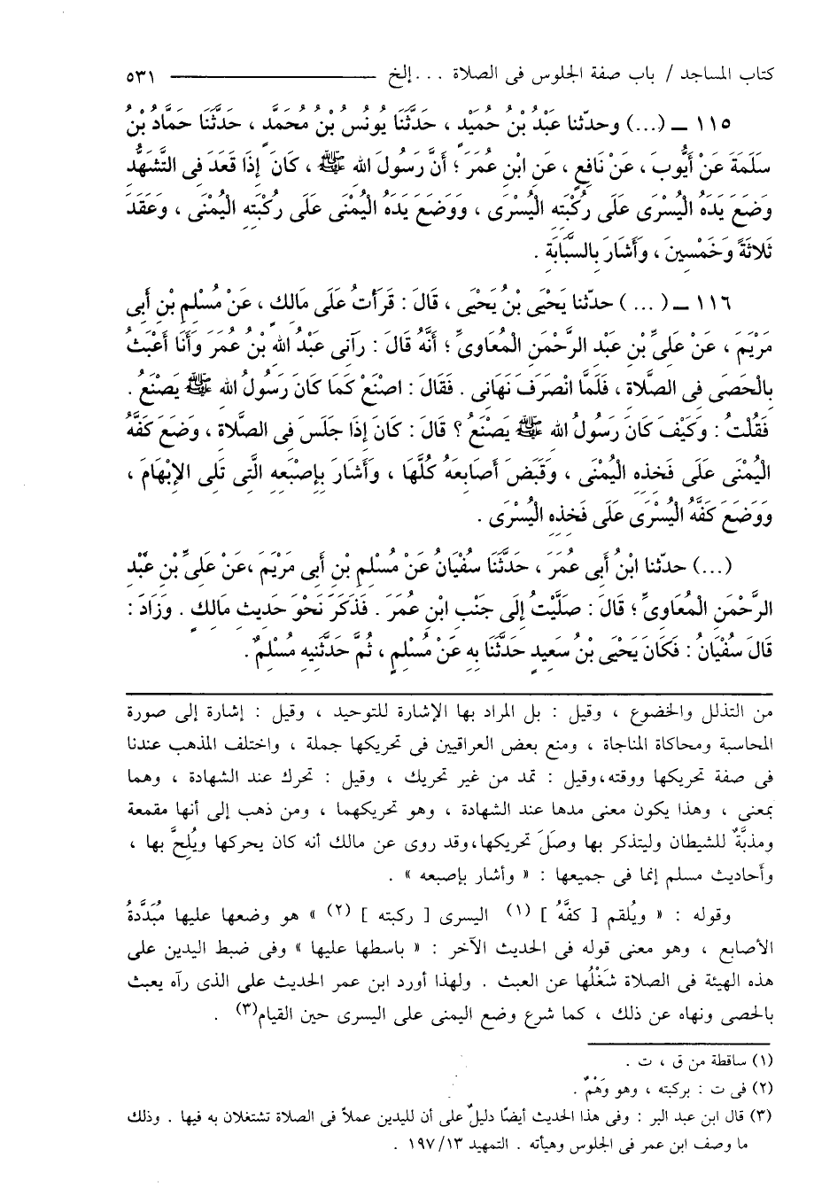 116 - (...) حدّثنا يَحْيَى بْنُ يَحْيَى، قَالَ: قَرَأْتُ عَلَى مَالِكٍ، عَنْ مُسْلِمِ بْنِ أَبِى مَرْيَمَ، عَنْ عَلِىِّ بْنِ عَبْدِ الرَّحْمَنِ الْمُعَاوىِّ؛ أَنَّهُ قَالَ: رَآنِى عَبْدُ اللهِ بْنُ عُمَرَ وَأَنَا أَعْبَثُ بِالْحَصَى فِى الصَّلاةِ، فَلَمَّا انْصَرَفَ نَهَانِى. فَقَالَ: اصْنَعْ كَمَا كَانَ رَسُولُ اللهِ صَلَّى اللهُ عَلَيْهِ وَسَلَّمَ يَصْنَعُ. فَقُلْتُ: وَكَيْفَ كَانَ رَسُولُ اللهِ صَلَّى اللهُ عَلَيْهِ وَسَلَّمَ يَصْنَعُ؟ قَالَ: كَانَ إِذَا جَلَسَ فِى الصَّلاةِ، وَضَعَ كَفَّهُ الْيُمْنَى عَلَى فَخِذِهِ الْيُمْنَى، وَقَبَضَ أَصَابِعَهُ كُلَّهَا، وَأَشَارَ بِإِصْبَعِهِ الَّتِى تَلِى الإِبْهَامَ، وَوَضَعَ كَفَّهُ الْيُسْرَى عَلَى فَخِذِهِ الْيُسْرَى.