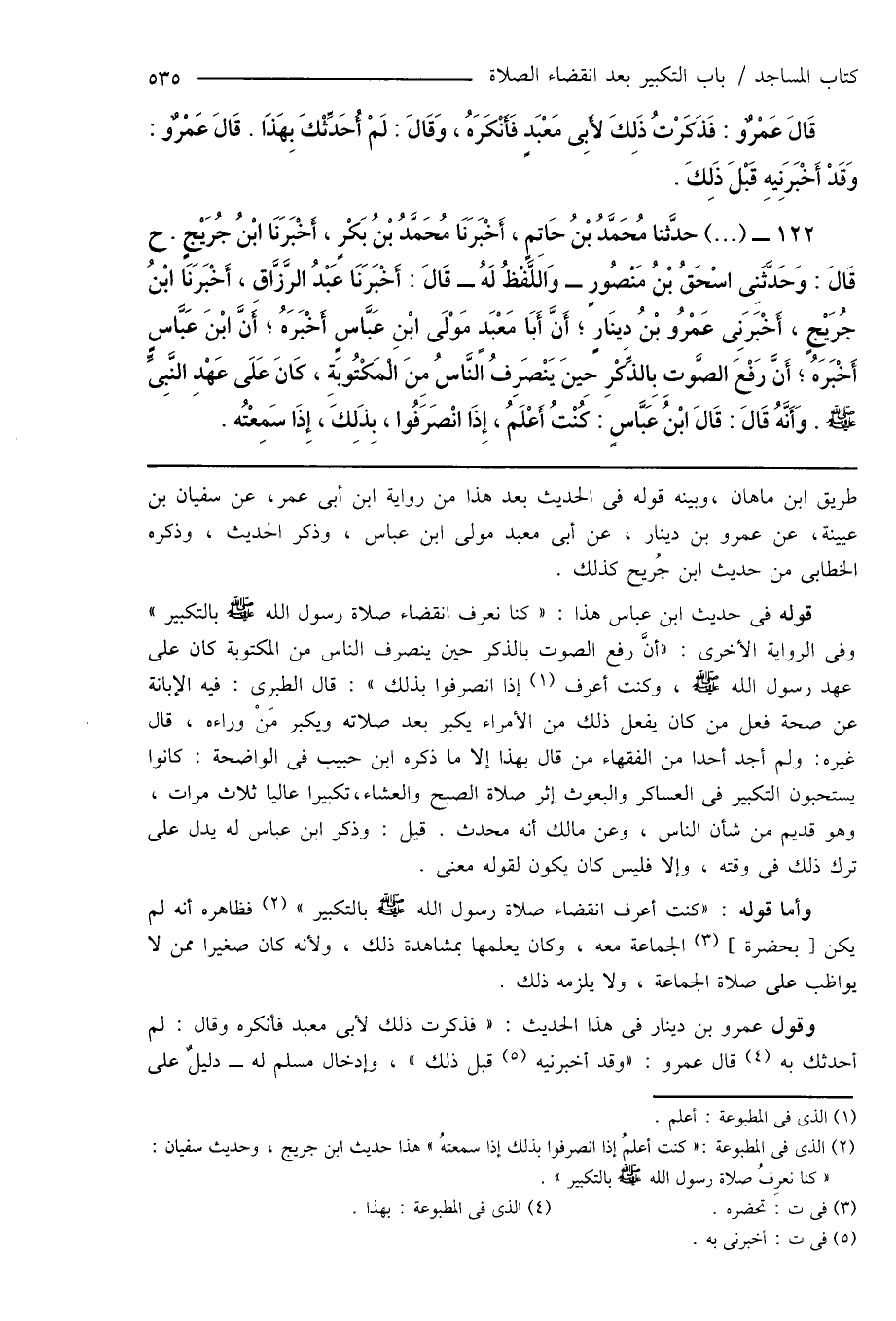 122 - (...) حدَّثنا مُحَمَّدُ بْنُ حَاتِمٍ، أَخْبَرَنَا مُحَمَّدُ بْنُ بَكْرٍ، أَخْبَرَنَا ابْنُ جُرَيْجٍ. ح قَالَ: وَحَدَّثَنِى اسْحَاقُ بْنُ مَنْصُورٍ - وَاللَّفْظُ لَهُ - قَالَ: أَخْبَرَنَا عَبْدُ الرَّزَّاقِ، أَخْبَرَنَا ابْنُ جُرَيْجٍ، أَخْبَرَنِى عَمْرُو بْنُ دِينَارٍ؛ أَنَّ أَبَا مَعْبَدٍ مَوْلَى ابْنِ عَبَّاسٍ أَخْبَرَهُ؛ أَنَّ ابْنَ عَبَّاسٍ أَخْبَرَهُ؛ أَنَّ رَفْعَ الصَّوتِ بِالذِّكْرِ حِينَ يَنْصَرِفُ النَّاسُ مِنَ الْمَكْتُوبَةِ، كَانَ عَلَى عَهْدِ النَّبِىِّ صَلَّى اللهُ عَلَيْهِ وَسَلَّمَ. وَأَنَّهُ قَالَ: قَالَ ابْنُ عَبَّاسٍ: كُنْتُ أَعْلَمُ، إِذَا انْصَرَفُوا، بِذَلِكَ، إِذَا سَمِعْتُه.