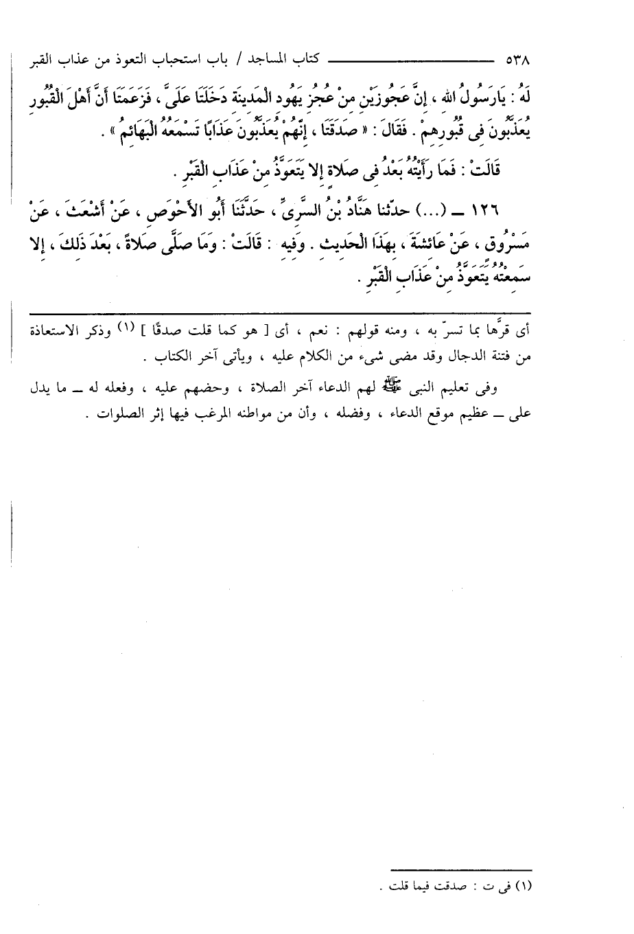 126 - (...) حدّثنا هَنَّادُ بْنُ السَّرِىِّ، حَدَّثَنَا أَبُو الأَحْوَصِ، عَنْ أَشْعَثَ، عَنْ مَسْرُوقٍ، عَنْ عَائِشَةَ، بِهَذَا الْحَدِيثِ. وَفِيهِ: قَالَتْ: وَمَا صَلَّى صَلاةً، بَعْدَ ذَلِكَ، إِلا سَمِعْتُهُ يَتَعَوَّذُ مِنْ عَذَابِ الْقَبْرِ.
