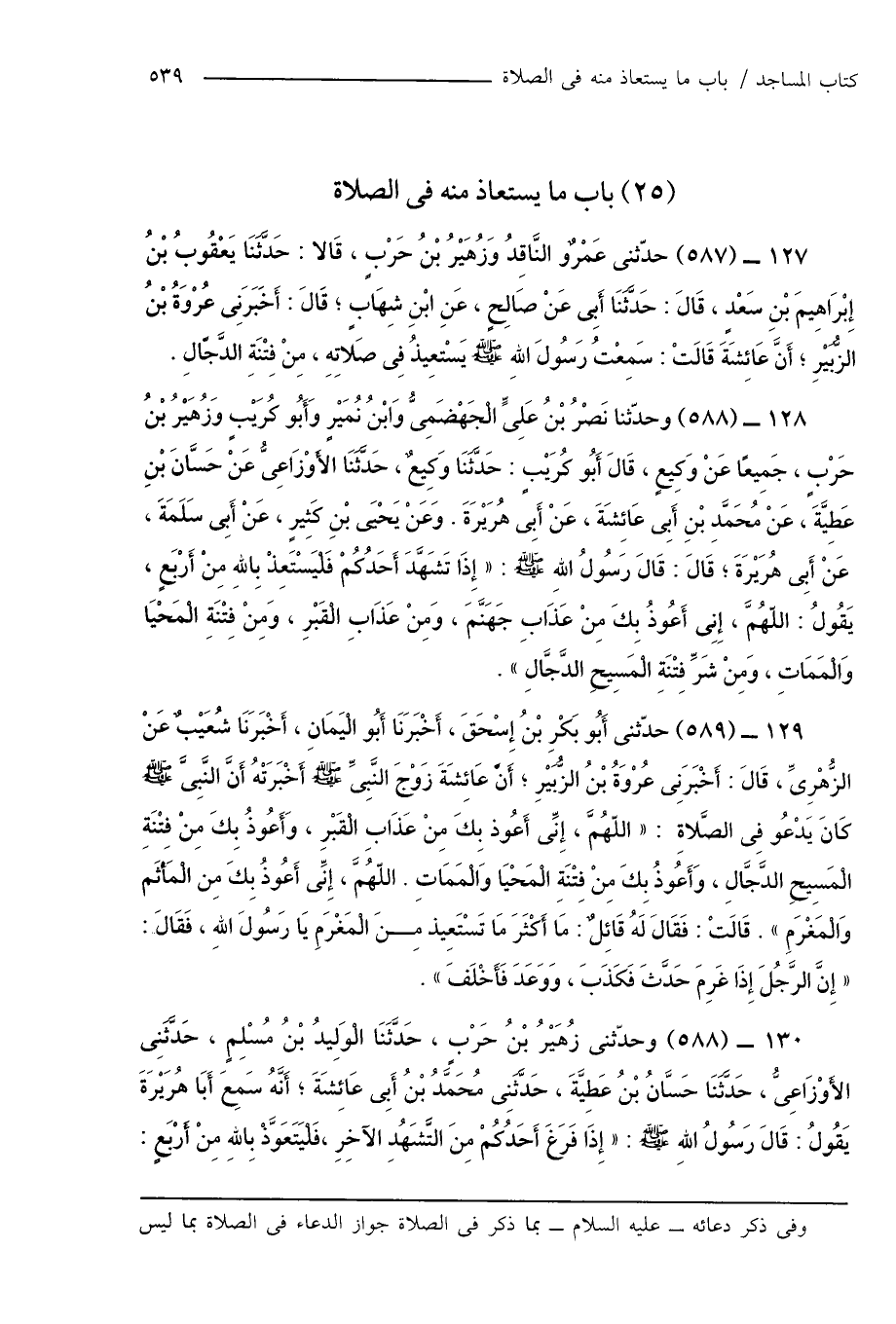 127 - (587) حدّثنى عَمْرٌو النَّاقِدُ وَزُهَيْرُ بْنُ حَرْبٍ، قَالا: حَدَّثَنَا يَعْقُوبُ بْنُ إِبْرَاهِيمَ بْنِ سَعْدٍ، قَالَ: حَدَّثَنَا أَبِى عَنْ صَالِحٍ، عَنِ ابْنِ شِهَابٍ؛ قَالَ: أَخَبَرَنِى عُرْوَةُ بْنُ الزُّبَيْرِ؛ أَنَّ عَائِشَةَ قَالَتْ: سَمِعْتُ رَسُولَ اللهِ صَلَّى اللهُ عَلَيْهِ وَسَلَّمَ يَسْتعِيذُ فِى صَلَاتِهِ، مِنْ فِتْنَةِ الدَّجَّالِ.