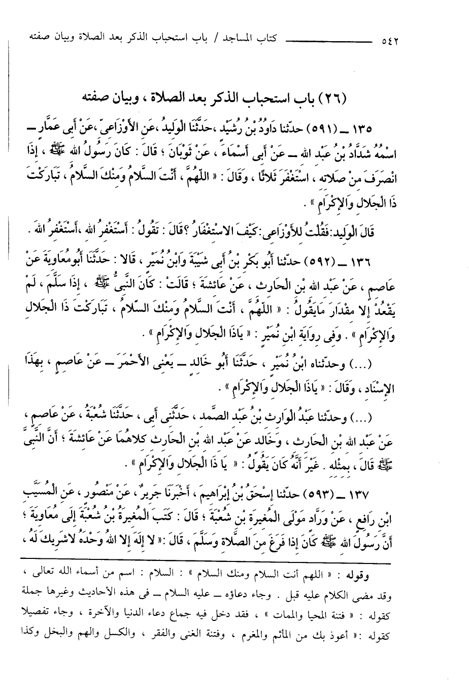 135 - (591) حدّثنا دَاوُدُ بْنُ رُشَيْدٍ، حَدَّثَنَا الْوَلِيدُ، عَنِ الأَوْزَاعِىِّ، عَنْ أَبِى عَمَّارٍ - اسْمُهُ شَدَّادُ بْنُ عَبْدِ اللهِ - عَنْ أَبِى أَسْمَاءَ، عَنْ ثَوْبَانَ؛ قَالَ: كَانَ رَسُولُ اللهِ صَلَّى اللهُ عَلَيْهِ وَسَلَّمَ، إِذَا انْصَرَفَ مِنْ صَلاتِهِ، اسْتَغْفَرَ ثَلاثًا، وَقَالَ: " اللهُمَّ، أَنْتَ السَّلامُ وَمِنْكَ السَّلامُ، تَبَارَكْتَ ذَا الْجَلالِ وَالإِكْرَامِ ".