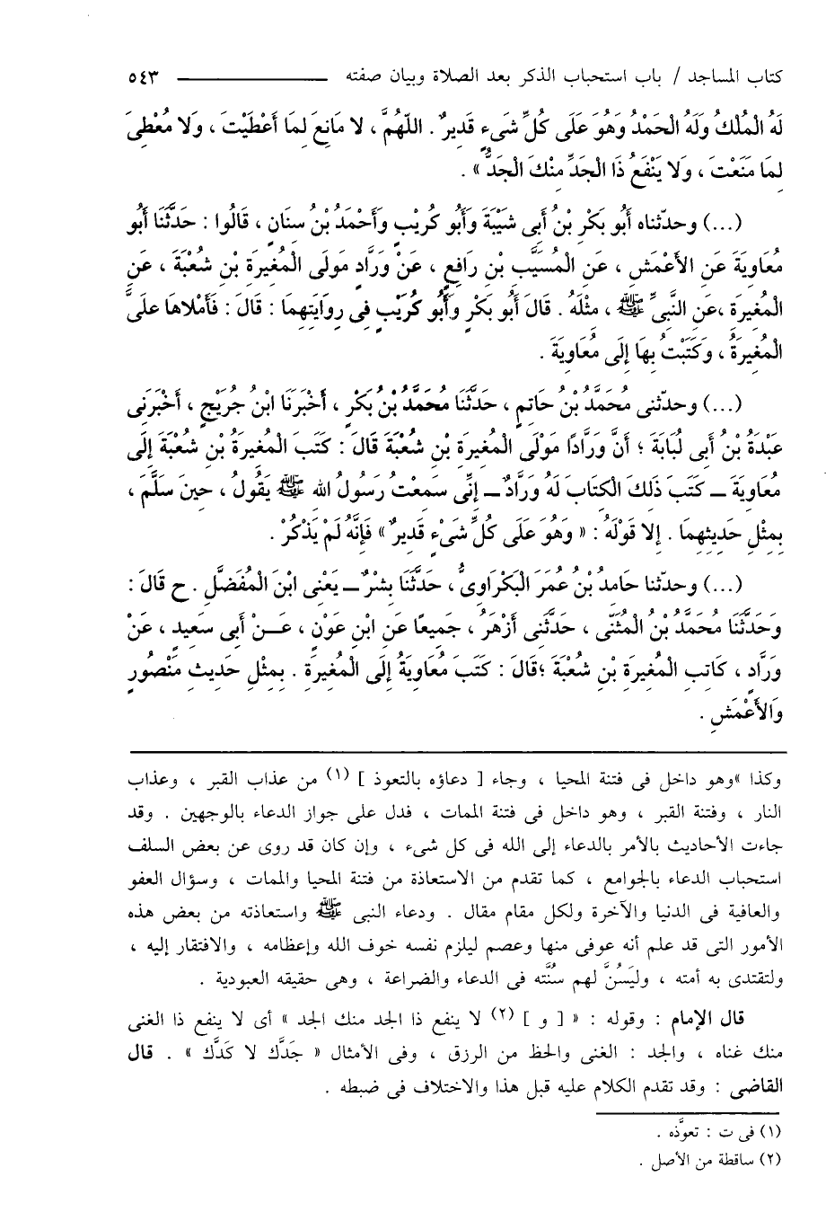 (...) وحدّثناه أَبُو بَكْرِ بْنُ أَبِى شَيْبَةَ وَأَبُو كُريْبٍ وَأَحْمَدُ بْنُ سِنَانٍ، قَالُوا: حَدَّثَنَا أَبُو مُعَاوِيَةَ عَنِ الأَعْمَشِ، عَنِ الْمُسَيّبِ بْنِ رَافِعٍ، عَنْ وَرَّادٍ مَولَى الْمُغِيرَةِ بْنِ شُعْبَةَ، عَنِ الْمُغِيرَةِ، عَنِ النَّبِىِّ صَلَّى اللهُ عَلَيْهِ وَسَلَّمَ، مِثْلَهُ. قَالَ أَبُو بَكْرٍ وَأَبُو كُرَيْبٍ فِى رِوَايَتِهِمَا: قَالَ: فَأَمْلاهَا علَىَّ الْمُغِيرَةُ، وَكَتَبْتُ بِهَا إِلَى مُعَاوِيَةَ.