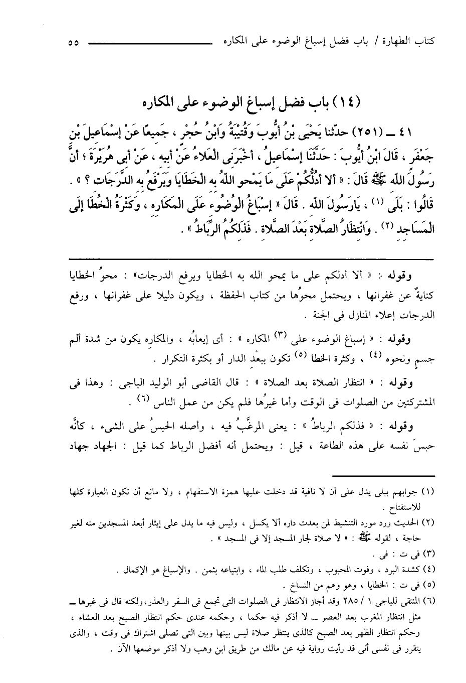 41 - (251) حدّثنا يَحْيَى بْنُ أَيُّوبَ وَقُتيْبَةُ وَابْنُ حُجْرٍ، جَمِيعًا عَنْ إِسْمَاعِيلَ بْنِ جَعْفَرٍ، قَالَ ابْنُ أَيُّوبَ: حَدَّثَنَا إِسْمَاعِيلُ، أَخْبَرَنِى الْعَلاءُ عَنْ أَبِيهِ، عَنْ أَبِى هُرَيْرَةَ؛ أَنَّ رَسُولَ اللهِ صَلَّى اللهُ عَلَيْهِ وَسَلَّمَ قَالَ: " إِلَّا أدُلُّكُمْ عَلَى مَا يَمْحو اللهُ بِهِ الْخَطَايَا وَيَرْفَعُ بِهِ الدَّرَجَاتِ؟ ". قَالُوا: بَلَى (¬1)، يَا رَسُولَ اللهِ. قَالَ " إسْبَاغُ الْوُضُوءَ عَلَى الْمَكَارِهِ، وَكَثْرَةُ الْخُطَا إِلَى الْمَسَاجِدِ (¬2). وَانْتِظَارُ الصَّلاةِ بَعْدَ الصَّلاةِ. فَذَلِكُمُ الرِّبَاطُ ".