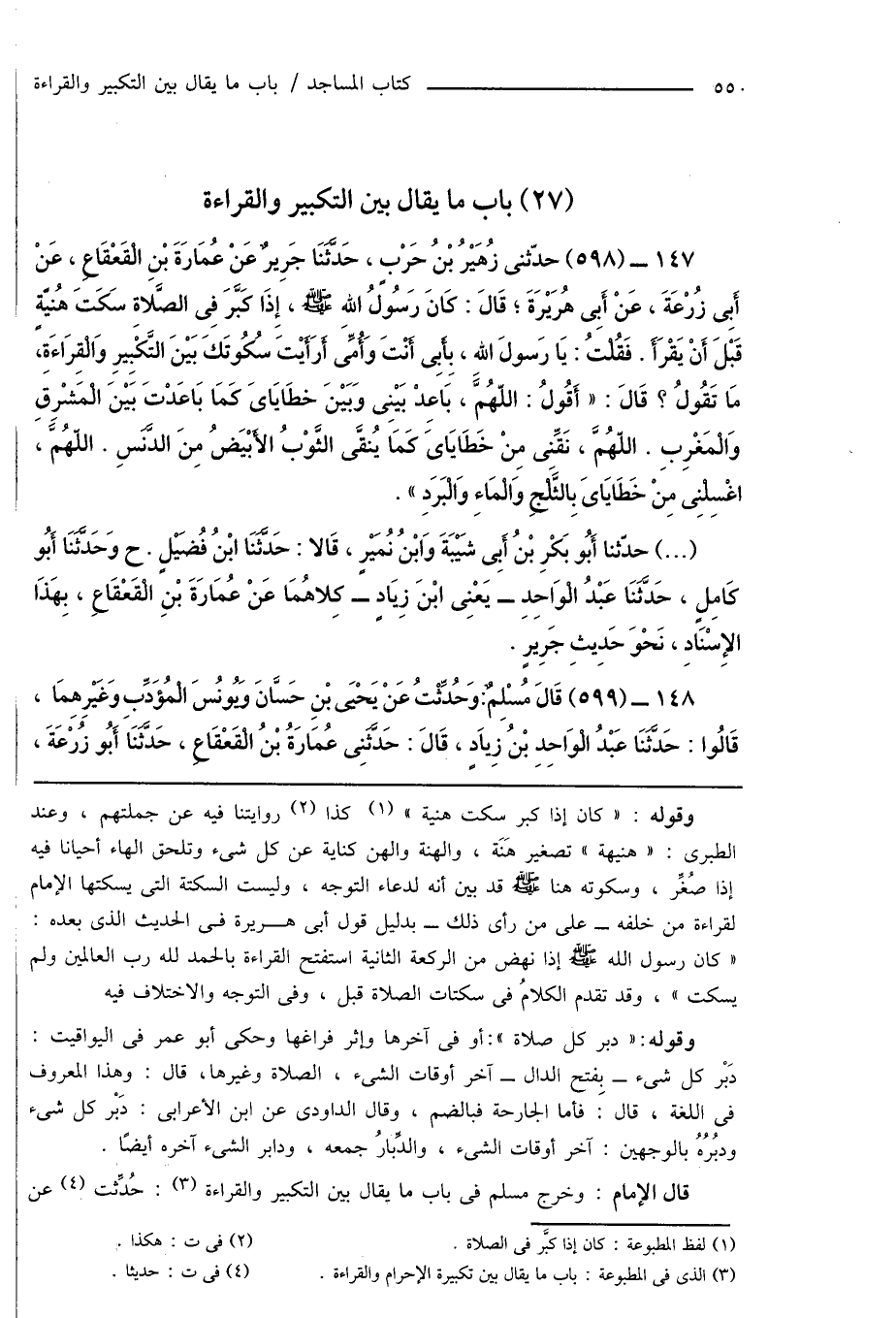 147 - (598) حدّثنى زُهَيْرُ بْنُ حَرْبٍ، حَدَّثَنَا جَرِيرٌ عَنْ عُمَارَةَ بْنِ الْقَعْقَاعِ، عَنْ أَبِى زُرْعَةَ، عَن أَبِى هُرَيْرَةَ؛ قَالَ: كَانَ رَسُولُ اللهِ صَلَّى اللهُ عَلَيْهِ وَسَلَّمَ، إِذَا كَبَّرَ فِى الصَّلاةِ سَكَتَ هُنيّةٍ قَبْلَ أَنْ يَقْرَأَ. فَقُلْتُ: يَا رَسُولَ اللهِ، بِأَبِى أَنْتَ وَأُمِّى أَرَأَيْتَ سُكُوتَكَ بَيْنَ التَّكْبِيرِ وَالْقرَاءَةِ، مَا تَقُولُ؟ قَالَ: " أَقُولُ: اللهُمَّ، بَاعِدْ بَيْنِى وَبَيْنَ خطَايَاىَ كَمَا بَاعَدْتَ بَيْنَ الْمَشْرِقِ وَالْمَغْرِبِ. اللهُمَّ، نَقِّنِى مِنْ خَطَايَاىَ كَمَا يُنقَّى الثَّوْبُ الأَبْيَضُ مِنَ الدَّنَسِ. اللهُمَّ، اغْسِلْنِى مِنْ خَطَايَاىَ بِالثَّلْجِ وَالْمَاءِ وَالْبَرَدِ ".
