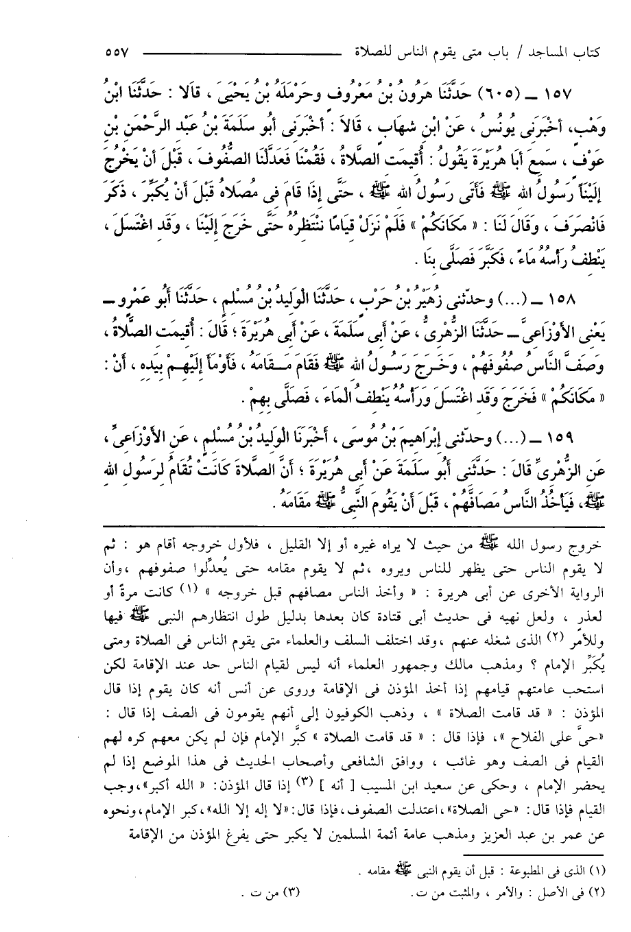 159 - (...) وحدّثنى إِبْرَاهِيمَ بْنُ مُوسَى، أَخْبَرَنَا الْوَلِيدُ بْنُ مُسْلِمٍ، عَنِ الأَوْزَاعِىِّ، عَنِ الزُّهْرِىِّ قَالَ: حَدَّثَنِى أَبُو سَلَمَةَ عَنْ أَبِى هُرَيْرَةَ، أَنَّ الصَّلاةَ كَانَتْ تُقَامُ لِرَسُولِ اللهِ صَلَّى اللهُ عَلَيْهِ وَسَلَّمَ، فَيَأْخُذُ النَّاسُ مَصَافَّهُمْ، قَبْلَ أَنْ يَقُومَ النَّبِىُّ صَلَّى اللهُ عَلَيْهِ وَسَلَّمَ مَقَامَهُ.