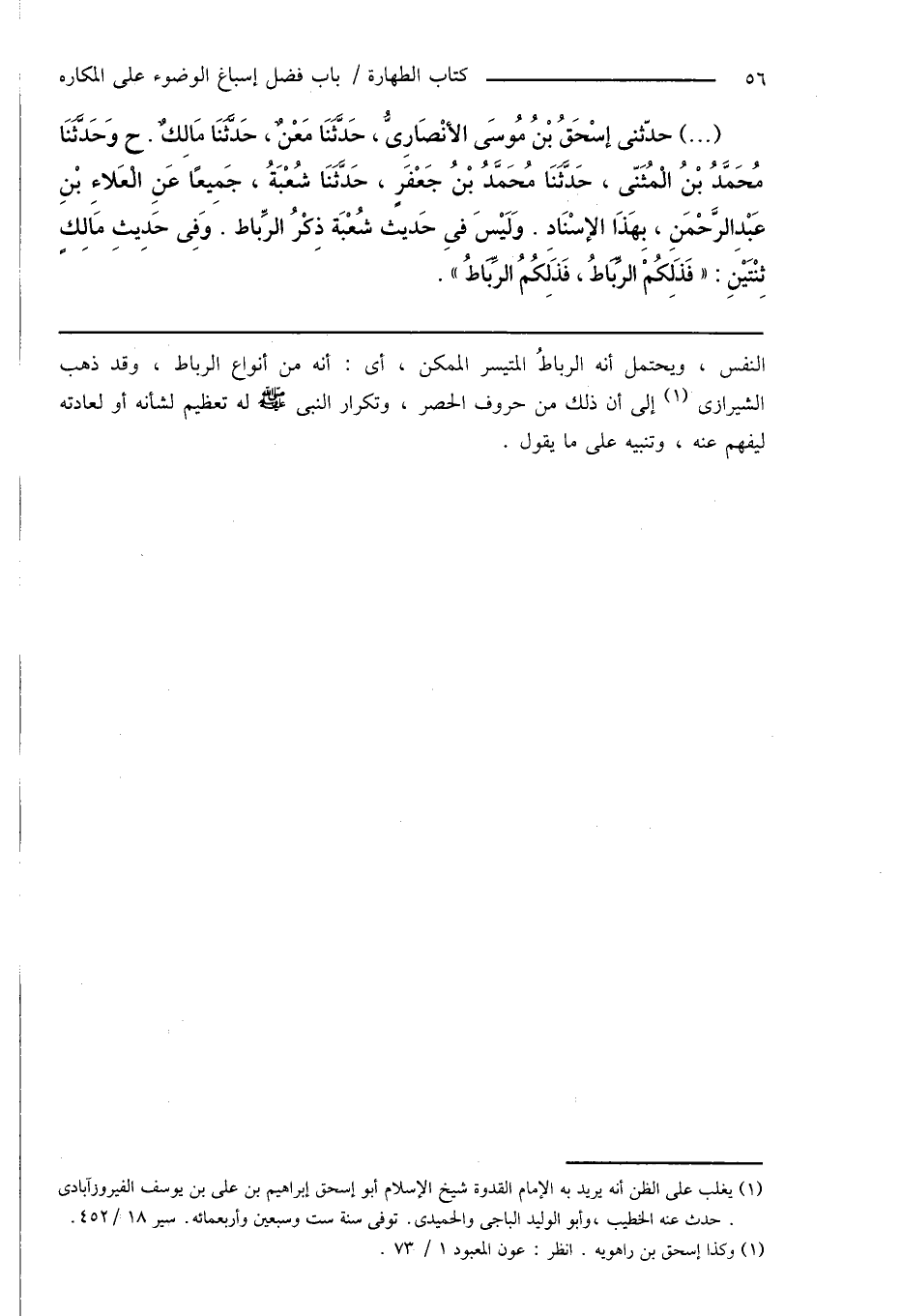 (...) حدّثنى إِسْحَاقُ بْنُ مُوسَى الأَنْصَارِىُّ، حَدَّثَنَا مَعْنٌ، حَدَّثَنَا مَالِكٌ. ح وَحَدَّثَنَا مُحَمَّدُ بْنُ الْمُثَنّى، حَدَّثَنَا مُحَمَّدُ بْنُ جَعْفرٍ، حَدَّثَنَا شُعْبَةُ، جَمِيعًا عَنِ الْعَلاءِ بْنِ عَبْدِ الرَّحْمَنِ، بِهَذَا الإِسْنَادِ. وَلَيْسَ فِى حَدِيث شُعْبَة ذِكْرُ الرِّباط. وَفِى حَدِيثِ مَالِكٍ ثِنْتَيْنِ: " فَذَلِكُمْ الرِّبَاطُ، فَذَلِكُمُ الرِّبَاطُ ".