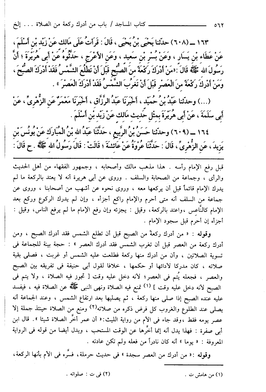 163 - (608) حدّثنا يَحْيَى بْنُ يَحْيَى، قَالَ: قَرَأْتُ عَلَى مَالِكٍ عَنْ زَيْدِ بْنِ أَسْلَمَ، عَنْ عَطَاءِ بْنِ يَسَارٍ، وَعَنْ بُسْرِ بْنِ سَعِيدٍ، وَعَنِ الأَعْرَجِ، حَدَّثُوهُ عَنْ أَبى هُرَيْرَةَ؛ أَنَّ رَسُولَ اللهِ صَلَّى اللهُ عَلَيْهِ وَسَلَّمَ قَالَ: " مَنْ أَدْرَكَ رَكْعَةً مِنَ الصُّبْحِ قَبْلَ أَنْ تَطْلُعَ الشَّمْسُ فَقَدْ أَدْرَكَ الصُّبْحَ، وَمَنْ أَدْركَ رَكْعَةً مِنَ الْعَصْرِ قَبْلَ أَنْ تَغرُبَ الشَّمْسُ فَقَدْ أَدْرَكَ الْعَصْرَ ".