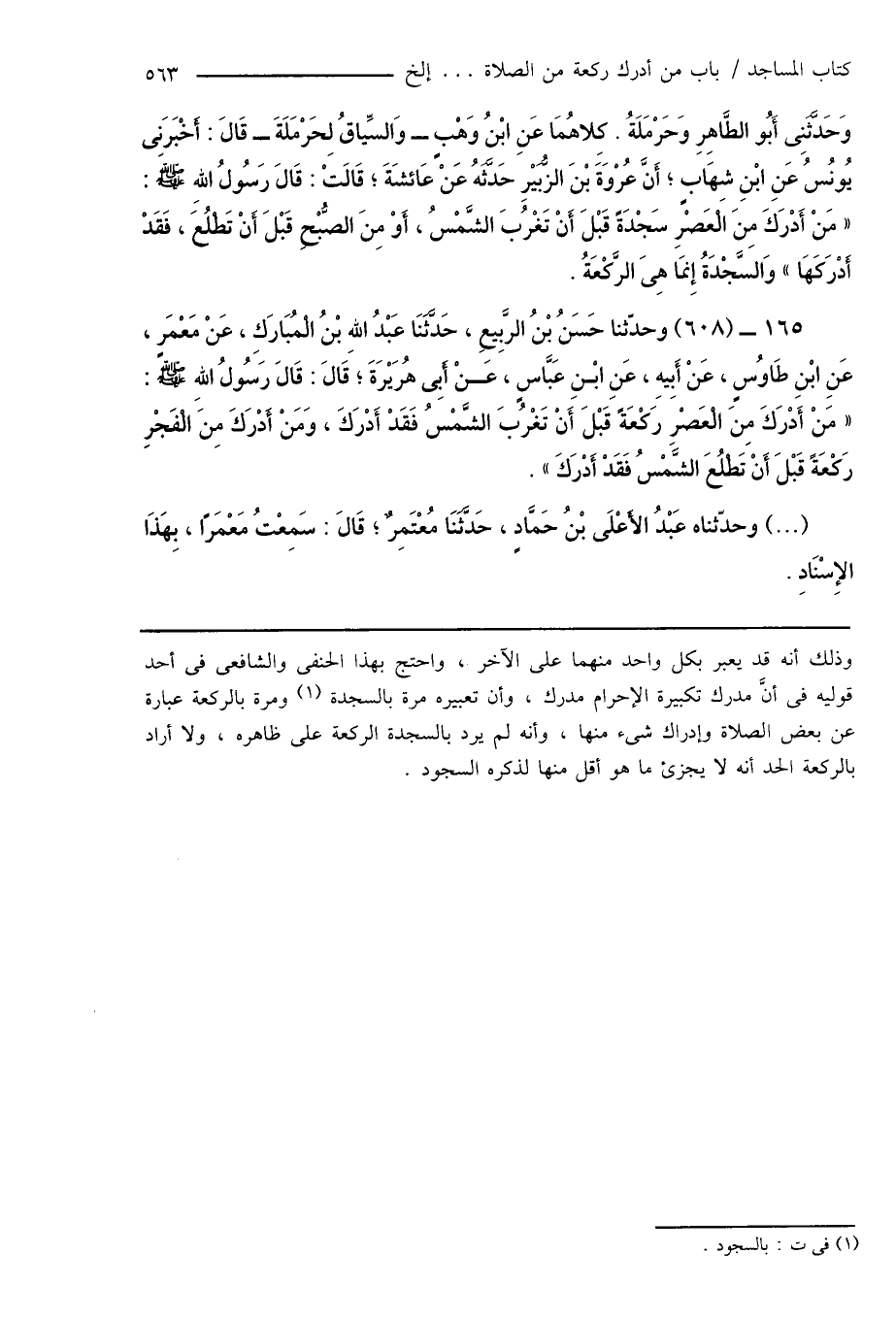 وَحَدَّثَنِى أَبُو الطَّاهِرِ وَحَرْمَلَةُ. كِلاهُمَا عَنِ ابْنُ وَهْبٍ - وَالسِّياقُ لِحَرْمَلَةَ - قَالَ: أَخْبَرَنِى يُونُسُ عَنِ ابْنِ شِهَابٍ؛ أَنَّ عُرْوَةَ بْنَ الزُّبَيْرِ حَدَّثَهُ عَنْ عَائِشَةَ؛ قَالَتْ: قَالَ رَسُولُ اللهِ صَلَّى اللهُ عَلَيْهِ وَسَلَّمَ: " مَنْ أَدْرَكَ مِنَ الْعَصْرِ سَجْدَةً قَبْلَ أَنْ تَغْرُبَ الشَّمْسُ، أَوْ مِنَ الصُّبْحِ قَبْلَ أَنْ تَطْلُعَ، فَقَدْ أَدْرَكَهَا " وَالسَّجْدَةُ إِنَّمَا هِىَ الرَّكْعَةُ.