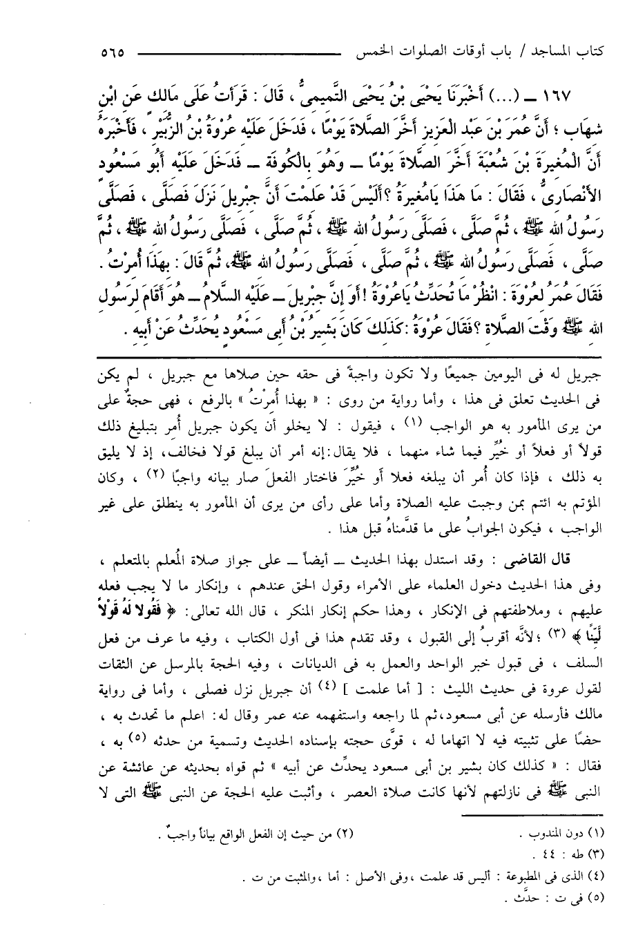 167 - (...) أَخْبَرَنَا يَحْيَى بْنُ يَحْيَى التَّمِيمِىُّ، قَالَ: قَرَأْتُ عَلَى مَالِكٍ عَنِ ابْنِ شِهَابٍ؛ أَنَّ عُمَرَ بْنَ عَبْدِ الْعَزِيزِ أَخَّرَ الصَّلاةَ يَوْمًا، فَدَخَلَ عَلَيْهِ عُرْوَةُ بْنُ الزُّبَيْرِ، فَأَخْبَرَهُ أَنَّ الْمُغِيرَةَ بْنَ شُعْبَةَ أَخَّرَ الصَّلاةَ يَوْمًا - وَهُوَ بِالْكُوفَةِ - فَدَخَلَ عَلَيْهِ أَبُو مَسْعُودٍ الأَنْصَارِىُّ، فَقَالَ: مَا هَذَا يَا مُغِيرَةُ؟ أَلَيْسَ قَدْ عَلِمْتَ أَنَّ جبْرِيلَ نَزَلَ فَصَلَّى، فَصَلَّى رَسُولُ اللهِ صَلَّى اللهُ عَلَيْهِ وَسَلَّمَ، ثُمَّ صَلَّى، فَصَلَّىَ رَسُولُ اللهِ صَلَّى اللهُ عَلَيْهِ وَسَلَّمَ، ثُمَّ صَلَّى، فَصَلَّى رَسُولُ اللهِ صَلَّى اللهُ عَلَيْهِ وَسَلَّمَ، ثُمَّ صَلَّى، فَصَلَّى رَسُولُ اللهِ صَلَّى اللهُ عَلَيْهِ وَسَلَّمَ، ثُمَّ صَلَّى، فَصَلَّى رَسُولُ اللهِ صَلَّى اللهُ عَلَيْهِ وَسَلَّمَ، ثُمَّ قَالَ: بِهَذَا أُمِرْتُ. فَقَالَ عُمَرُ لِعُرْوَةَ: انْظُرْ مَا تُحَدَّثُ يَا عُرْوَةُ! أَوَ إِنَّ جِبْرِيلَ - عَلَيْهِ السَّلامُ - هُوَ أَقَامَ لِرَسُولِ اللهِ صَلَّى اللهُ عَلَيْهِ وَسَلَّمَ وَقْتَ الصَّلاةِ؟ فَقَالَ عُرْوَةُ: كَذَلِكَ كَانَ بَشِيرُ بْنُ أَبِى مَسْعُودٍ يُحَدِّثُ عَنْ أَبِيهِ.