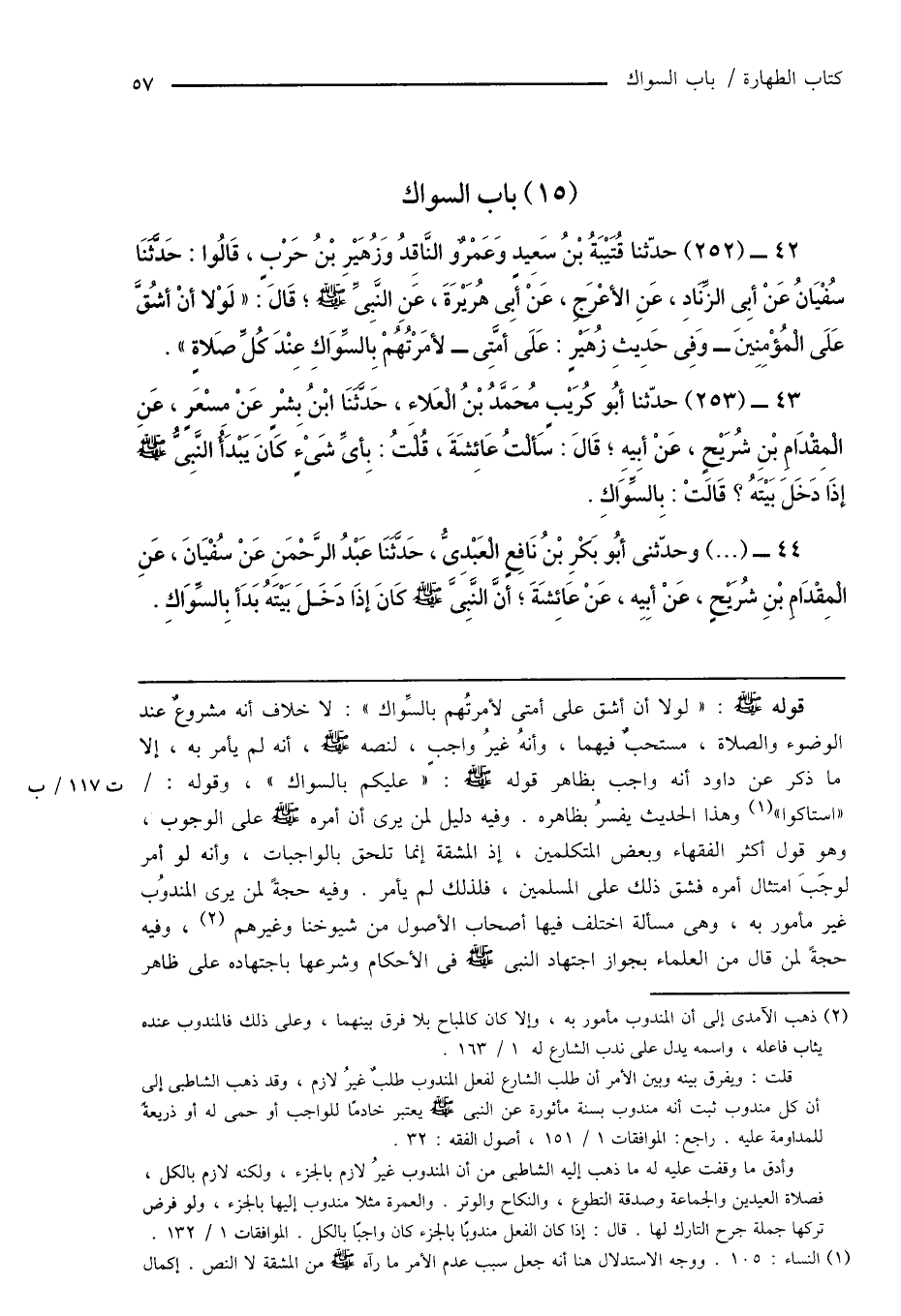 42 - (252) حدّثنا قُتَيْبَةُ بْنُ سَعِيدٍ وَعَمْرٌو النَّاقِدُ وَزُهَيْرِ بْنُ حَرْبٍ، قَالُوا: حَدَّثَنَا سُفْيَانُ عَنْ أَبِى الزِّنَادِ، عَنِ الأَعْرَجِ، عَنْ أَبِى هُرَيْرَةَ، عَنِ النَّبِىِّ صَلَّى اللهُ عَلَيْهِ وَسَلَّمَ؛ قَالَ: " لَوْلا أَنْ أَشُقَّ عَلَى الْمُؤْمِنِينَ - وَفِى حَدِيثِ زُهَيْرٍ: عَلَى أُمَّتِى - لأَمَرْتُهُمْ بِالسِّوَاكِ عِنْدَ كُلِّ صَلاةٍ ".
