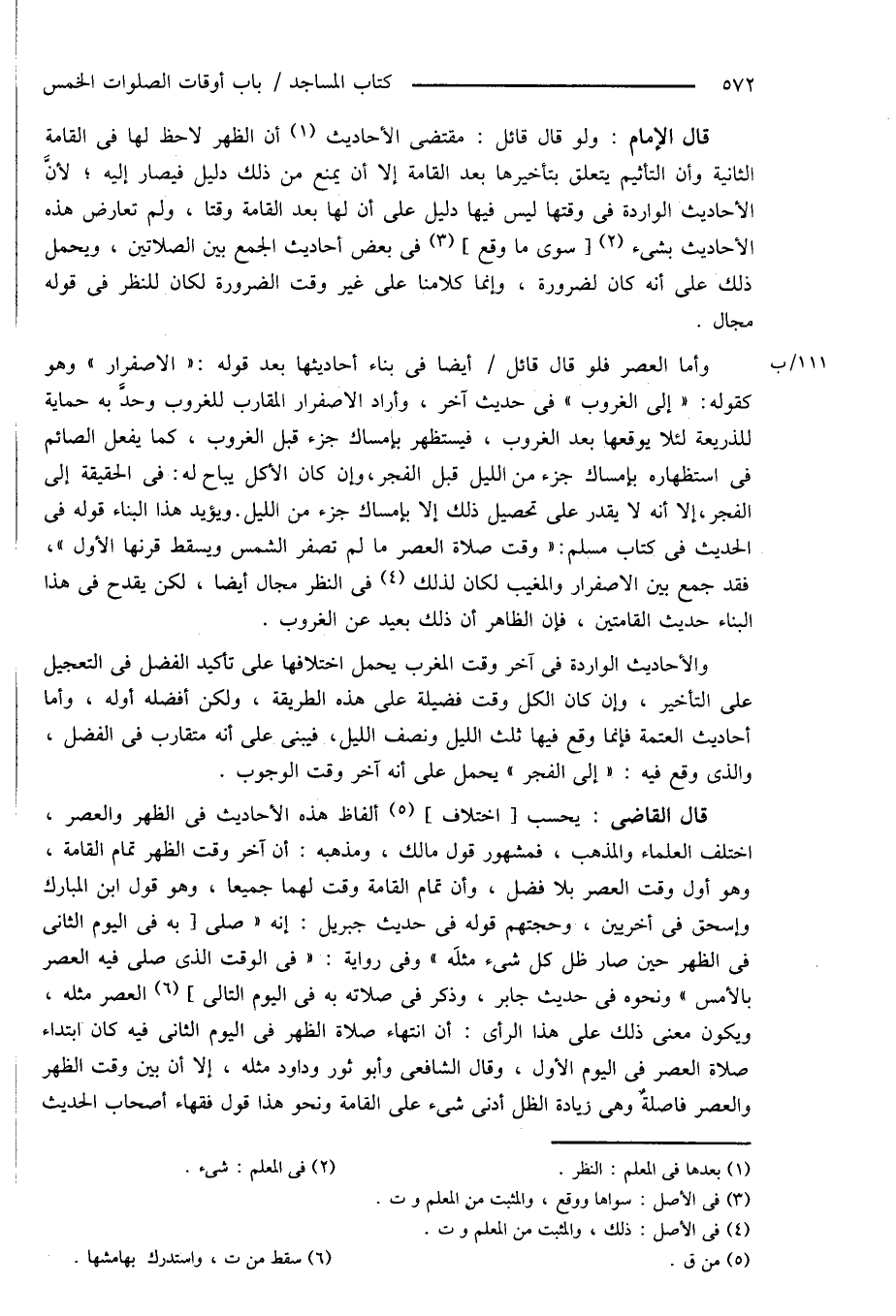 قال القاضى: يحسب [اختلاف] (¬5) ألفاظ هذه الأحاديث فى الظهر والعصر، اختلف العلماء والمذهب، فمشهور قول مالك، ومذهبه: أن آخر وقت الظهر تمام القامة، وهو أول وقت العصر بلا فضل، وأن تمام القامة وقت لهما جميعاً، وهو قول ابن المبارك وإسحاق فى أخريين، وحجتهم قوله فى حديث جبريل: إنه " صلى [به فى اليوم الثانى فى الظهر حين صار ظل كل شىء مثلَه " وفى رواية: " فى الوقت الذى صلى فيه العصر بالأمس " ونحوه فى حديث جابر، وذكر فى صلاته به فى اليوم التالى] (¬6) العصر مثله، ويكون معنى ذلك على هذا الرأى: أن انتهاء صلاة الظهر فى اليوم الثانى فيه كان ابتداء صلاة العصر فى اليوم الأول، وقال الشافعى وأبو ثور وداود مثله، إِلا أن بين وقت الظهر والعصر فاصلةٌ وهى زيادة الظل أدنى شىء على القامة ونحو هذا قول فقهاء أصحاب الحديث