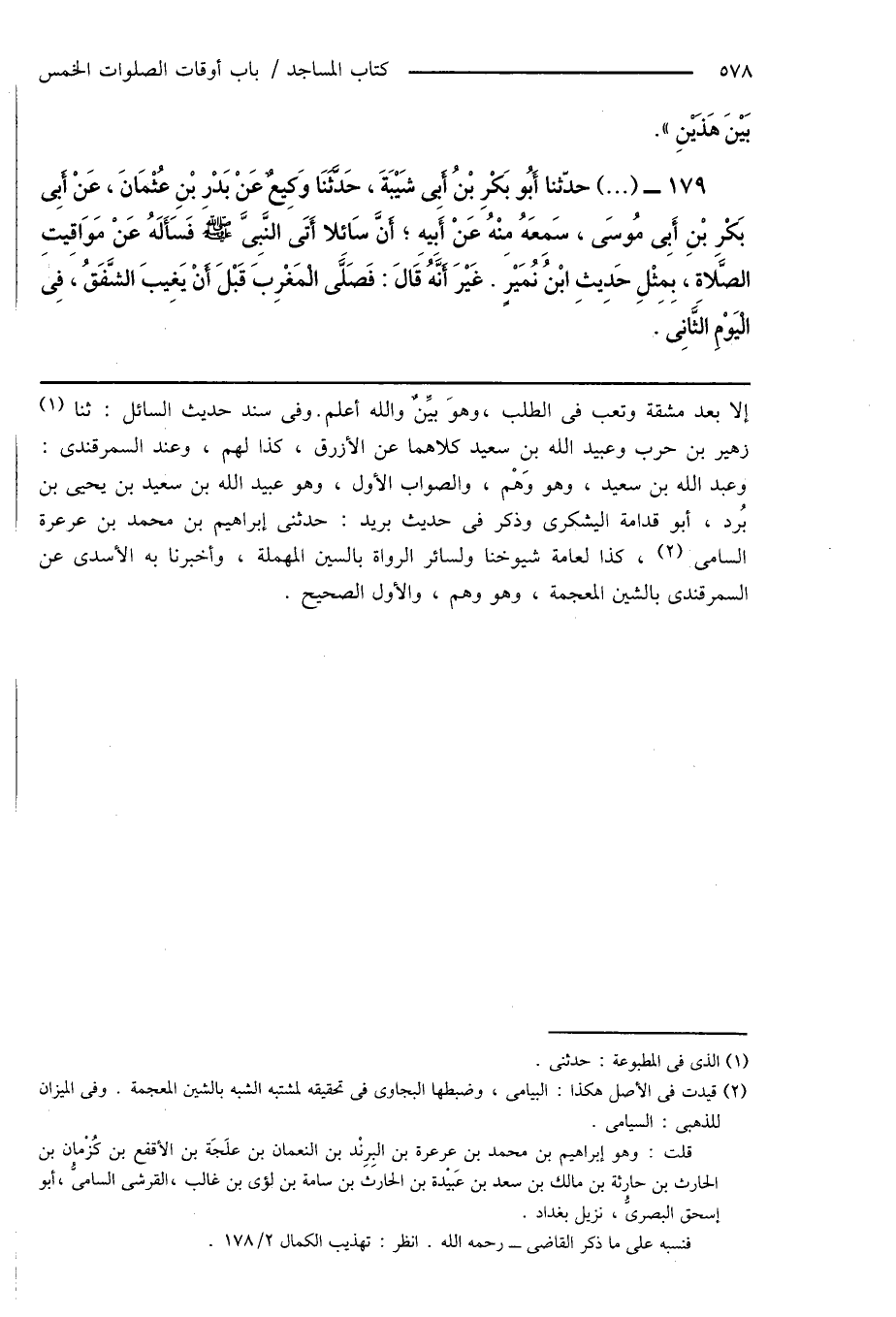 إِلا بعد مشقة وتعب فى الطلب، وهوَ بيِّنٌ والله أعلم. وفى سند حديث السائل: ثنا (¬1) زهير بن حرب وعبيد الله بن سعيد كلاهما عن الأزرق، كذا لهم، وعند السمرقندى: وعبد الله بن سعيد، وهو وَهْم، والصواب الأول، وهو عبيد الله بن سعيد بن يحيى بن بُرد، أبو قدامة اليشكرى وذكر فى حديث بريد: حدثنى إبراهيم بن محمد بن عرعرة السامى (¬2)، كذا لعامة شيوخنا ولسائر الرواة بالسين المهملة، وأخبرنا به الأسدى عن السمرقندى بالشين المعجمة، وهو وهم، والأول الصحيح.