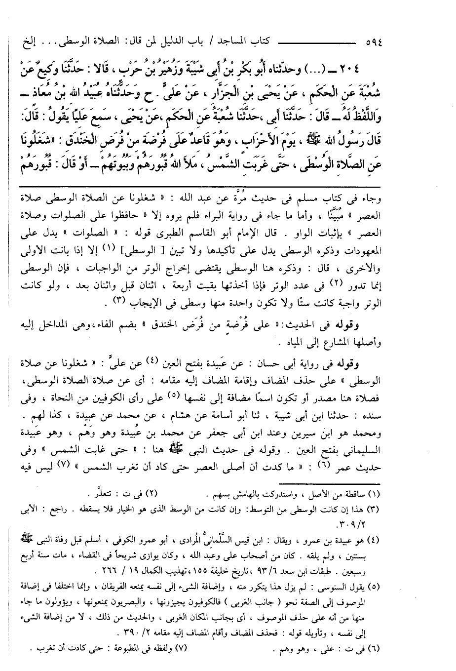 204 - (...) وحدّثناه أَبُو بَكْرِ بْنُ أَبِى شَيْبَةَ وَزُهَيْرُ بْنُ حَرْبٍ، قَالا: حَدَّثَنَا وَكيعٌ عَنْ شُعْبَةَ عَنِ الْحَكَمِ، عَنْ يَحْيَى بْنِ الْجَزَّارِ، عَنْ عَلِىٍّ. ح وَحَدَّثَنَاهُ عُبَيْدُ اللهِ بْنُ مُعَاذٍ - وَاللَّفْظُ لَهُ - قَالَ: حَدَّثَنَا أَبِى، حَدَّثَنَا شُعْبَةُ عَنِ الْحَكَمِ، عَنْ يَحْيَى، سَمِعَ عَلِيًّا يَقُولُ: قَالَ: قَالَ رَسُولُ الله صَلَّى اللهُ عَلَيْهِ وَسَلَّمَ، يَوْمَ الأَحْزَابِ، وَهُوَ قَاعِدٌ عَلَى فُرْضَةٍ مِنْ فُرَضِ الْخَنْدَقِ: " شَغَلُونَا عَنِ الصَّلاةِ الْوُسْطَى، حَتَّى غَرَبَتِ الشَّمْسُ، مَلأَ اللهُ قُبُورَهُمْ وَبُيُوتَهُمْ - أَوْ قَالَ: قُبُورَهُمْ