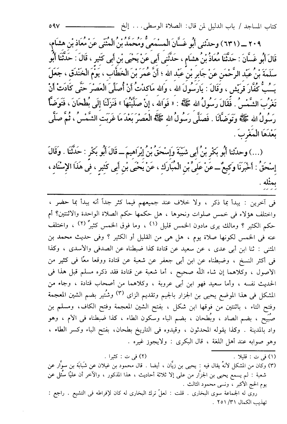 فى آخرين: يبدأ بما ذكر، ولا خلاف عند جميعهم فيما كثر جداً أنه يبدأ بما حضر، واختلف هؤلاء فى خمس صلوات ونحوها، هل حكمها حكم الصلاة الواحدة والاثنتين؟ أم حكم الكثير؟ ومالك يرى ما دون الخمس قليل (¬1)، وما فوق الخمس كثيرٌ (¬2)، واختلف عنه فى الخمس لكونها صلاة يوم، هل هى من القليل أو الكثير؟ وفى حديث محمد بن المثنى: ثنا ابن أبى عدى، عن سعيد عن قتادة كذا ضبطناه عن الصدفى والأسدى، وكذا فى أكثر النسخ، وضبطناه عن ابن أبى جعفر عن شعبة عن قتادة ووقعا معًا فى كثير من الأصول، وكلاهما إن شاء الله صحيح، أما شعبة عن قتادة فقد ذكره مسلم قبل هذا فى الحديث نفسه، وأما سعيد فهو ابن أبى عروبة، وكلاهما من أصحاب قتادة، وجاء من المشكل فى هذا الموضع يحيى بن الجزار بالجيم وتقديم الزاى (¬3) وشُتير بضم الشين المعجمة وفتح التاء، باثنتين من فوقها ابن شكل، بفتح الشين المعجمة وفتح الكاف، ومسلم بن صُبَيح، بضم الصاد، وبُطحان، بضم الباء وسكون الطاء، كذا ضبطناه فى الأم، وهو واد بالمدينة. وكذا يقوله المحدثون، وقيدوه فى التاريخ بطحان، بفتح الباء وكسر الطاء، وهو صوابه عند أهل اللغة، قال البكرى: ولا يجوز غيره.