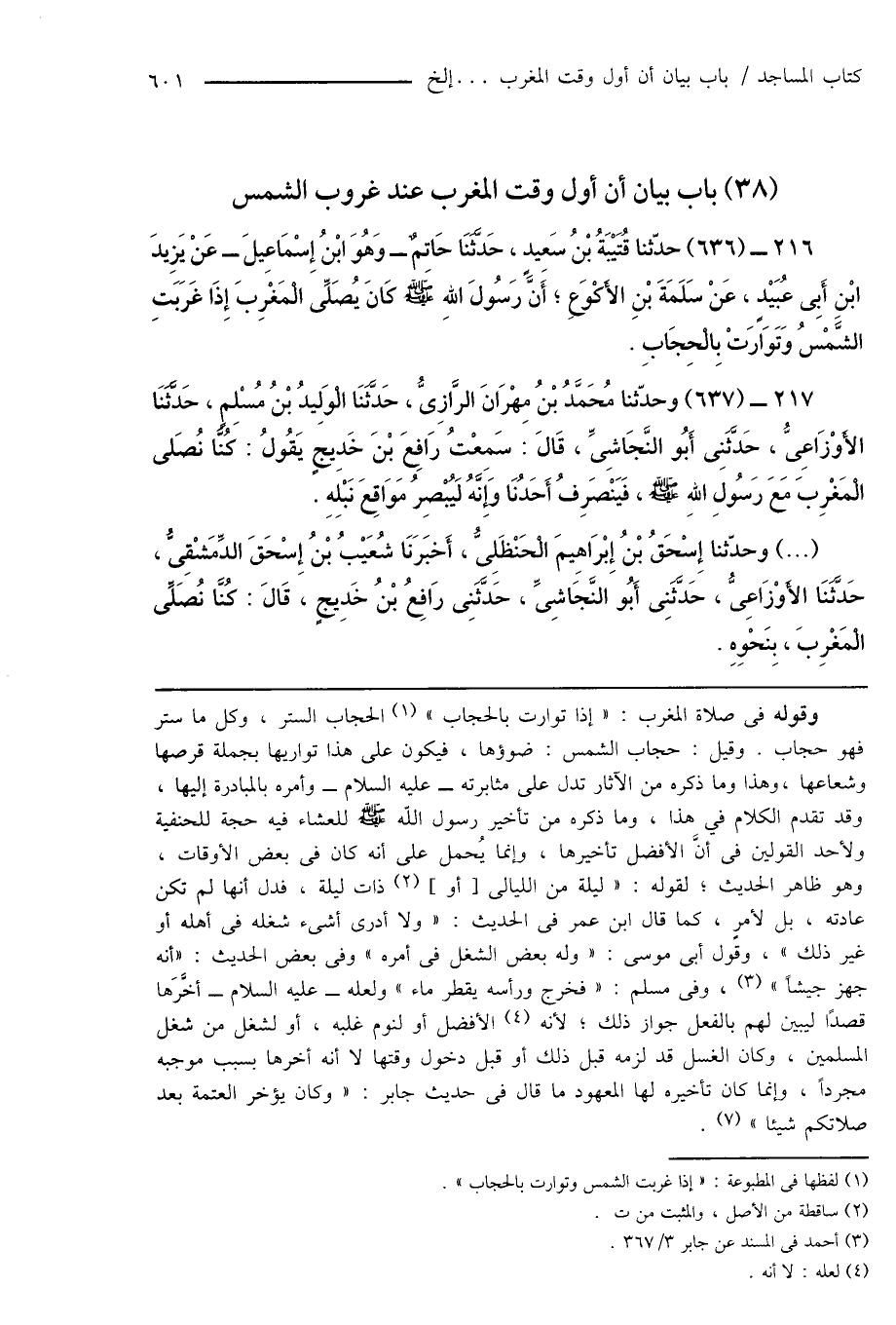 216 - (636) حدّثنا قُتَيْبَةُ بْنُ سَعِيدٍ، حَدَّثَنَا حَاتِمٌ - وَهُوَ ابْنُ إِسْمَاعِيلَ - عَنْ يَزِيدَ ابْنِ أَبِى عُبَيْدٍ، عَنْ سَلَمَةَ بْنِ الأَكْوَعِ؛ أَنَّ رَسُولَ اللهِ صَلَّى اللهُ عَلَيْهِ وَسَلَّمَ كَانَ يُصَلِّى الْمَغْرِبَ إِذَا غَرَبَتِ الشَّمْسُ وَتَوَارَتْ بِالْحِجَابِ.