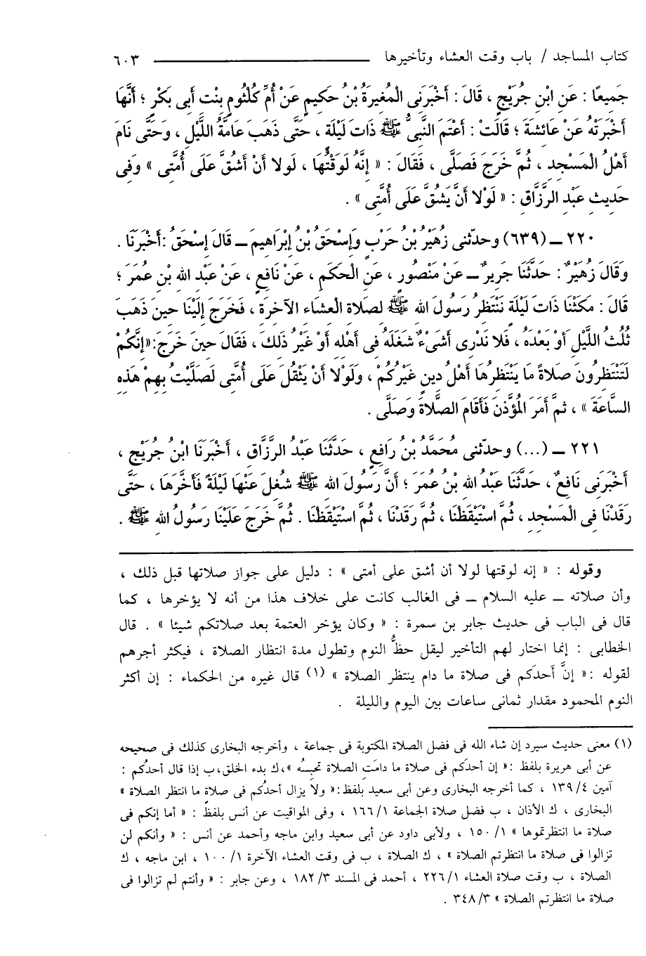 جَمِيعًا: عَنِ ابْنِ جُرَيْجٍ، قَالَ: أَخْبَرَنِى الْمُغِيرَةُ بْنُ حَكِيمٍ عَنْ أُمِّ كُلْثُومٍ بِنْتِ أَبِى بَكْرٍ؛ أَنَّهَا أَخْبَرَتْهُ عَنْ عَائِشَةَ؛ قَالَتْ: أَعْتَمَ النَّبِىُّ صَلَّى اللهُ عَلَيْهِ وَسَلَّمَ ذَاتَ لَيْلَةٍ، حَتَّى ذَهَبَ عَامَّةُ اللَّيْلِ، وَحَتَّى نَامَ أَهْلُ الْمَسْجِدِ، ثُمَّ خَرَجَ فَصَلَّى، فَقَالَ: " إِنَّهُ لَوَقْتُهَا، لَولا أَنْ أَشُقَّ عَلَى أُمَّتِى " وَفِى حَدِيثِ عَبْدِ الرَّزَّاقِ: " لَوْلا أَنَّ يَشُقَّ عَلَى أُمَّتِى ".