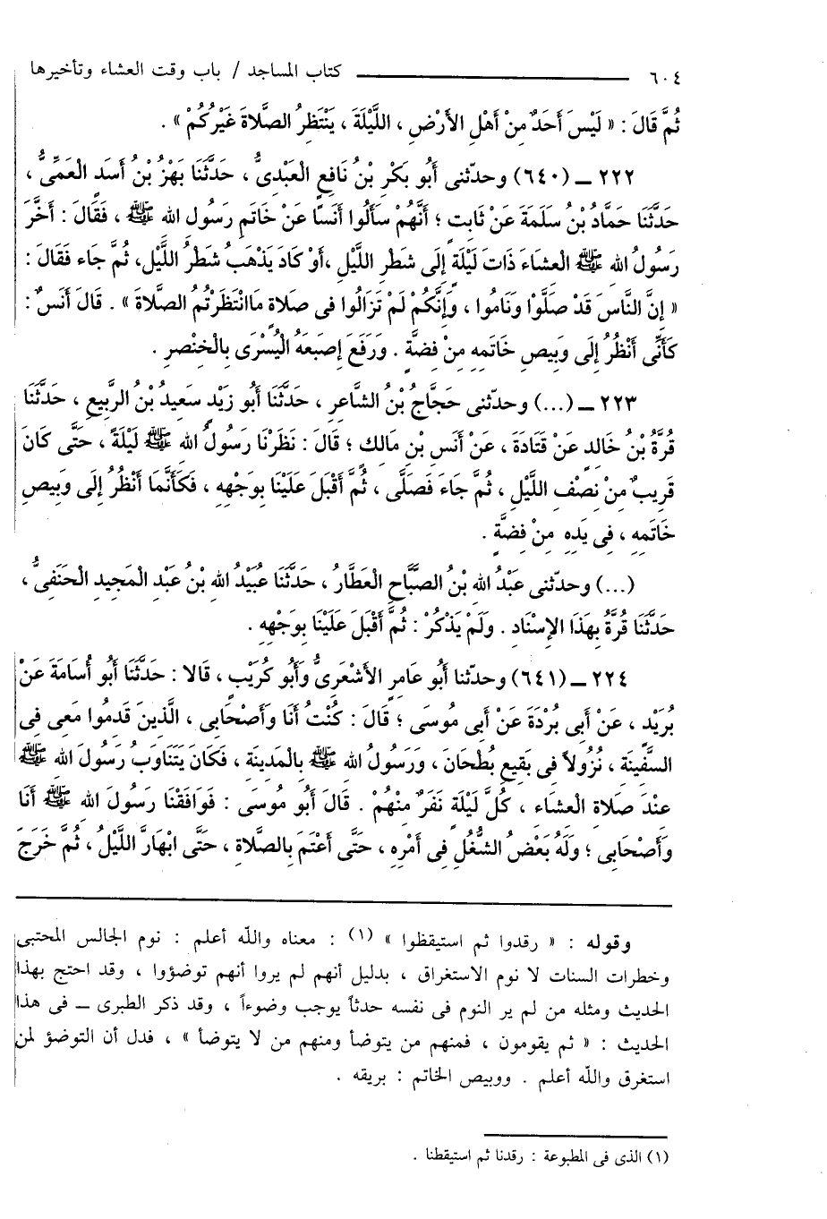 222 - (640) وحدّثنى أَبُو بَكْرِ بْنُ نَافِعٍ الْعَبْدِىُّ، حَدَّثَنَا بَهْزُ بْنُ أَسَدٍ الْعَمِّىُّ، حَدَّثَنَا حَمَّادُ بْنُ سَلَمَةَ عَنْ ثَابِتٍ؛ أَنَّهُمْ سَأَلُوا أَنَسًا عَنْ خَاتَمِ رَسُولِ اللهِ صَلَّى اللهُ عَلَيْهِ وَسَلَّمَ، فَقَالَ: أَخَّرَ رَسُولُ اللهِ صَلَّى اللهُ عَلَيْهِ وَسَلَّمَ الْعِشَاءَ ذَاتَ لَيْلَةٍ إِلَى شَطْرِ اللَّيْلِ، أَوْ كَادَ يَذْهَبُ شَطْرُ اللَّيْلِ، ثُمَّ جَاءَ فَقَالَ: " إِنَّ النَّاسَ قَدْ صَلَّوْا وَنَامُوا، وَإِنَّكُمْ لَمْ تَزَالُوا فِى صَلاةٍ مَا انْتَظَرْتُمُ الصَّلاةَ ". قَالَ أَنَسٌ: كَأَنِّى أَنْظُرُ إِلَى وَبِيصِ خَاتَمِهِ مِنْ فِضَّةٍ. وَرَفَعَ إِصَبعَهُ الْيُسْرَى بِالْخِنْصْرِ.
