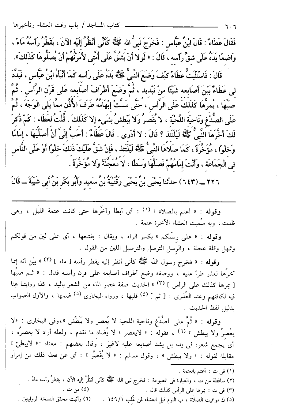 قَالَ: فَاسْتَثْبَتُّ عَطَاءً كَيْفَ وَضَعَ النَّبِىُّ صَلَّى اللهُ عَلَيْهِ وَسَلَّمَ يَدَهُ عَلَى رَأسِهِ كَمَا أَنْبَأَهُ ابْنُ عَبَّاسٍ، فَبَدَّدَ لِى عَطَاءٌ بَيْنَ أَصَابِعِهِ شَيْئًا مِنْ تَبْدِيدٍ، ثُمَّ وَضَعَ أَطرَافَ أَصَابِعِهِ عَلى قَرْنِ الرَّأسِ. ثُمَّ صَبَّهَا، يُمِرُّهَا كَذَلِكَ عَلَى الرَّأسِ، حَتَّى مَسَّتْ إِبْهَامُهُ طَرَفَ الأُذُنِ مِمَّا يَلِى الْوَجْهَ، ثُمَّ عَلَى الصُّدْغِ وَنَاحِيَةِ اللِّحْيَةِ، لا يُقَصرُ وَلا يَبْطِشُ بشَىءٍ إِلا كَذَلِكَ. قُلْتُ لِعَطَاءٍ: كَمْ ذُكِرَ لَكَ أَخَّرَهَا النَّبِىُّ صَلَّى اللهُ عَلَيْهِ وَسَلَّمَ لَيْلَتَئِذٍ؟ قَالَ: لا أَدْرِى. قَالَ عَطَاءٌ: أَحَبُّ إِلَىَّ أَنْ أُصَلَّيَهَا، إمَامًا وَخِلْوًا، مُؤَخَّرَةً، كَمَا صَلاهَا النَّبِىُّ صَلَّى اللهُ عَلَيْهِ وَسَلَّمَ لَيْلَتَئِذٍ، فَإِنْ شَقَّ عَلَيْكَ ذَلِكَ خِلْوًا أَوْ عَلَى النَّاسِ فِى الْجَمَاعَةِ، وَأَنْتَ إِمَامُهُمْ فَصَلِّهَا وَسَطًا، لا مُعَجَّلَةً وَلا مُؤَخَّرَةً.
