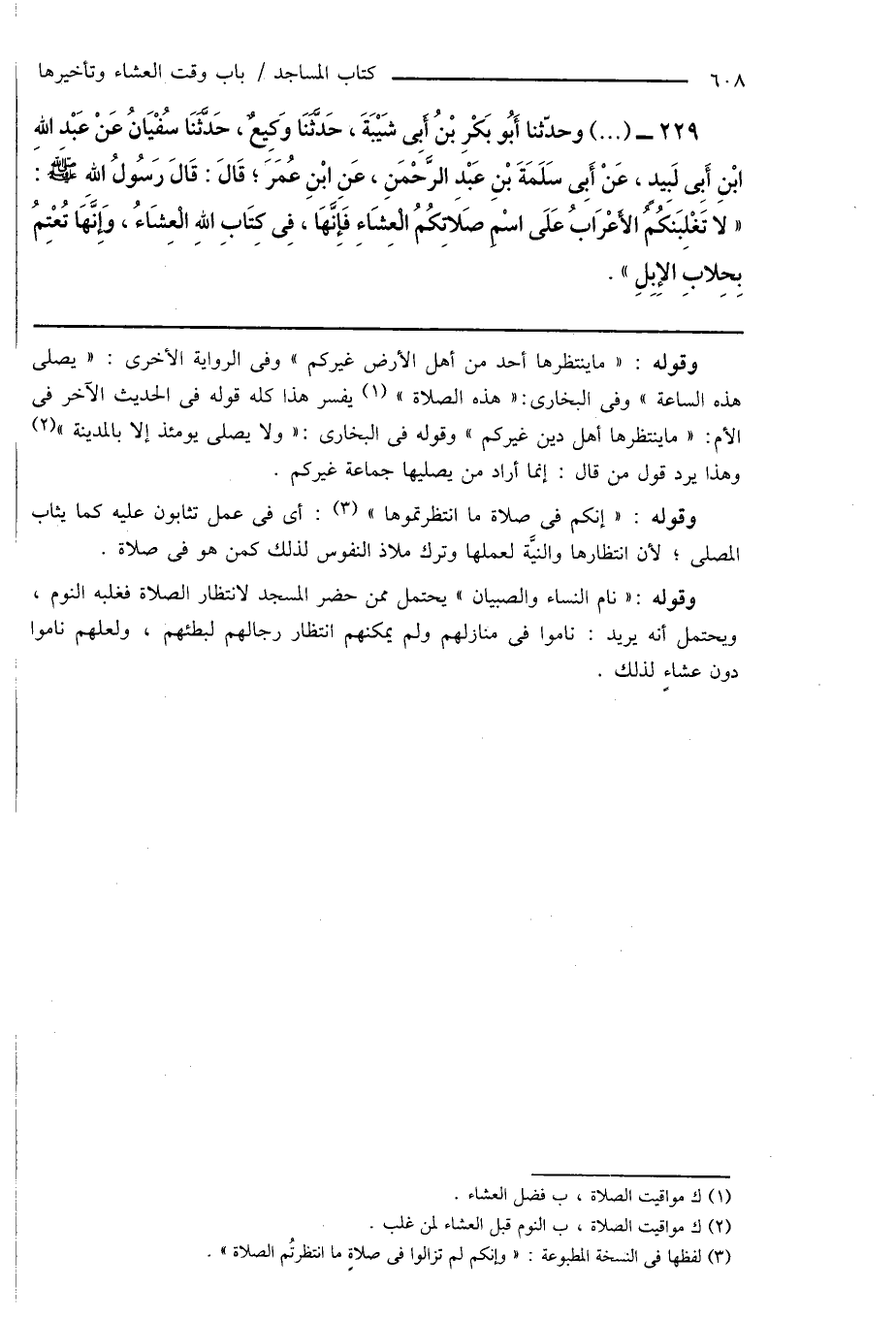 229 - (...) وحدّثنا أَبُو بَكْرِ بْنُ أَبِى شَيْبَةَ، حَدَّثَنَا وَكِيعٌ، حَدَّثَنَا سُفْيَانُ عَنْ عَبْدِ اللهِ ابْنِ أَبِى لَبِيدٍ، عَنْ أَبِى سَلَمَةَ بْنِ عَبْدِ الرَّحْمَنِ، عَنِ ابْنِ عُمَرَ؛ قَالَ: قَالَ رَسُولُ اللهِ صَلَّى اللهُ عَلَيْهِ وَسَلَّمَ. " لا تَغْلِبَنكُمُ الأَعْرَابُ عَلَى اسْمِ صَلاتِكُمُ الْعِشَاءِ فَإِنَّهَا فِى كِتَابِ اللهِ الْعِشَاءُ، وِإِنَّهَا تُعْتِمُ بِحِلابِ الإِبِلِ ".