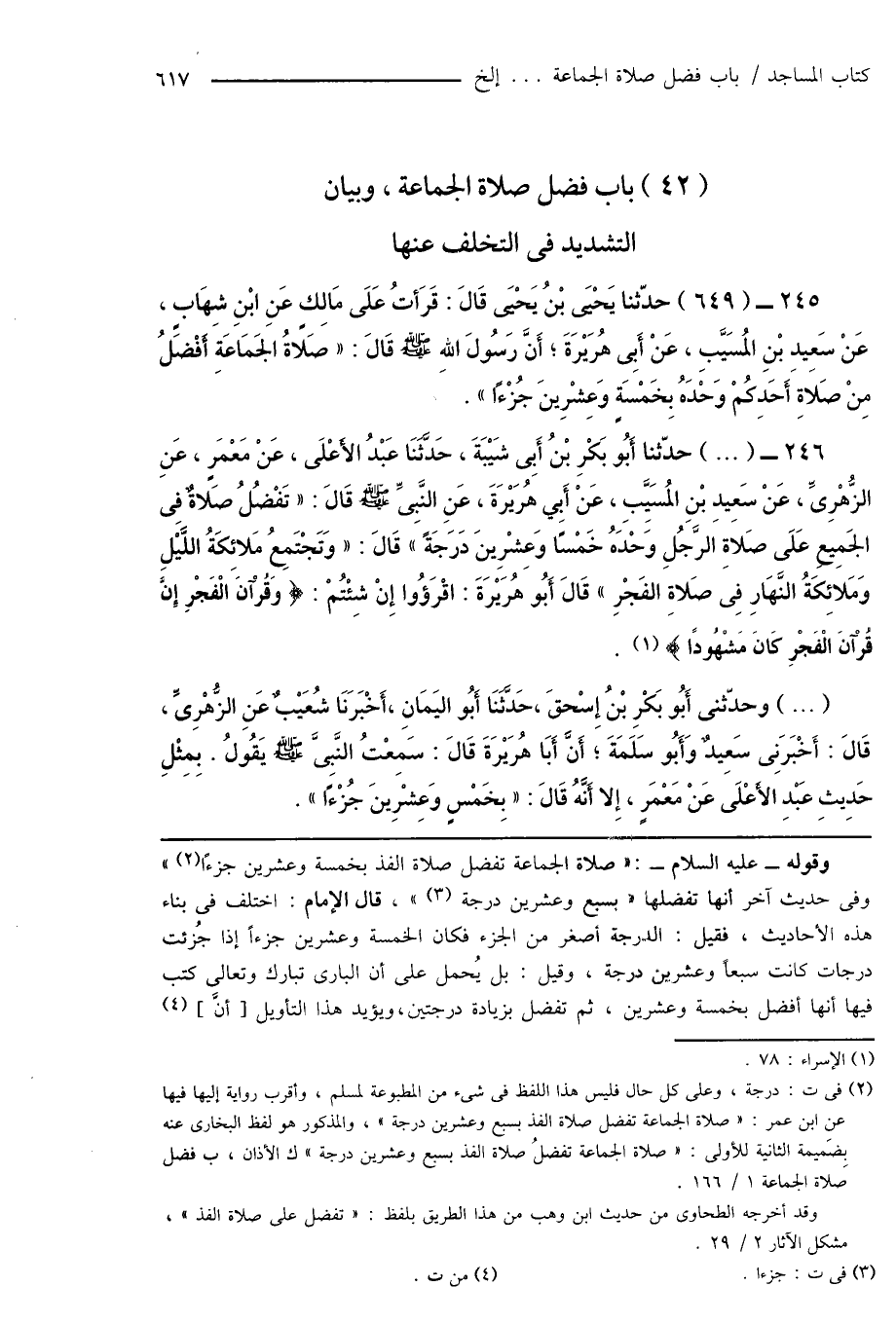 246 - (...) حدّثنا أَبُو بَكْرِ بْنُ أَبِى شَيْبَةَ، حَدَّثَنَا عَبْدُ الأَعْلَى، عَنْ مَعْمَرٍ، عَنِ الزُّهْرِىِّ، عَنْ سَعِيدِ بْنِ المُسَيّبِ، عَنْ أَبِي هُرَيْرَةَ، عَنِ النَّبِىِّ صَلَّى اللهُ عَلَيْهِ وَسَلَّمَ قَالَ: " تَفْضُلُ صَلاةٌ فِى الجَمِيعِ عَلَى صَلاةِ الرَّجُلِ وَحْدَهُ خَمْسًا وَعِشْرِينَ دَرَجَةً " قَالَ: " وَتَجْتَمِعُ مَلائِكَةُ اللَّيْلِ وَمَلائِكَةُ النَّهَارِ فِى صَلاةِ الفَجْرِ " قَالَ أَبُو هُرَيْرَةَ: اقْرَؤُوا إِنْ شِئْتُمْ: {وقُرْآنَ الْفَجْرِ إِنَّ قُرْآنَ الْفَجْرِ كَانَ مَشْهُودًا} (¬1).